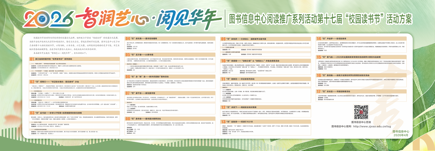 <p style="text-align: justify;"><span style="font-family: simsun, serif;">四月风暖,文韵悠长。我们即将迎来4月23日世界读书日,春风与书页相伴,艺术与文字相融。在浙艺,阅读不止于图书馆,更藏在校园的每一处角落。以笔墨、音符、舞姿表达热爱,以书籍沉淀艺术底色,无需仪式,心怀沉静,校园处处皆是阅读天地。</span></p>