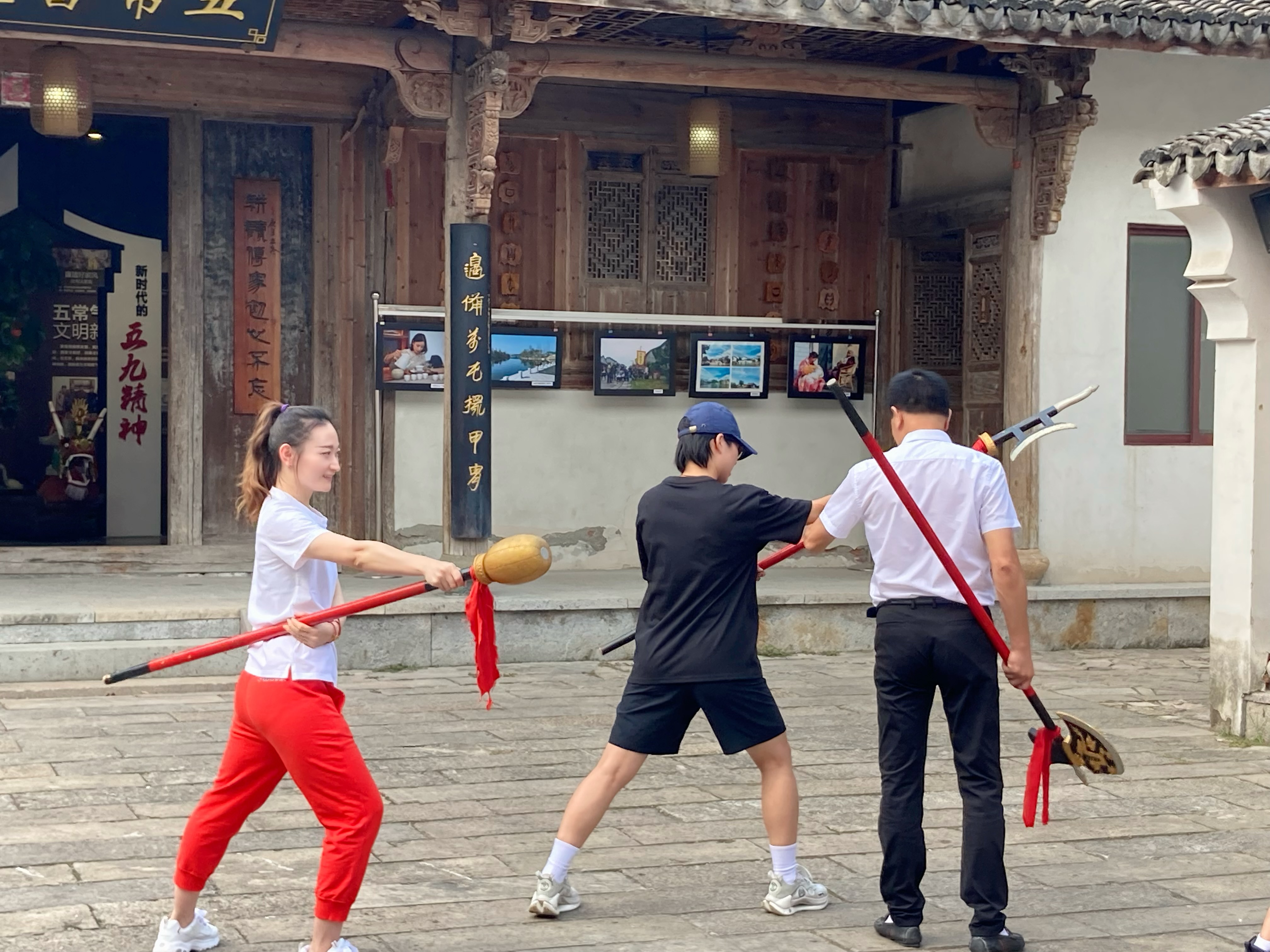 最后,科研团队参观了“五常十八般武艺”陈列馆,在陈列馆内,展出了由明代传承至今的“十八件”兵器,是非常宝贵的遗产,虽然历经年华与磨难,但仍然能感受到那精致的雕工与古人的智慧,不得不令人赞叹。陈列馆内除了展示兵器、传承人谱外,还展示了“五常十八般武艺”开展的各类活动、演出、赛事等,其中包含了一支特殊的队伍——女子“十八般武艺”队,是一道靓丽的风景线。