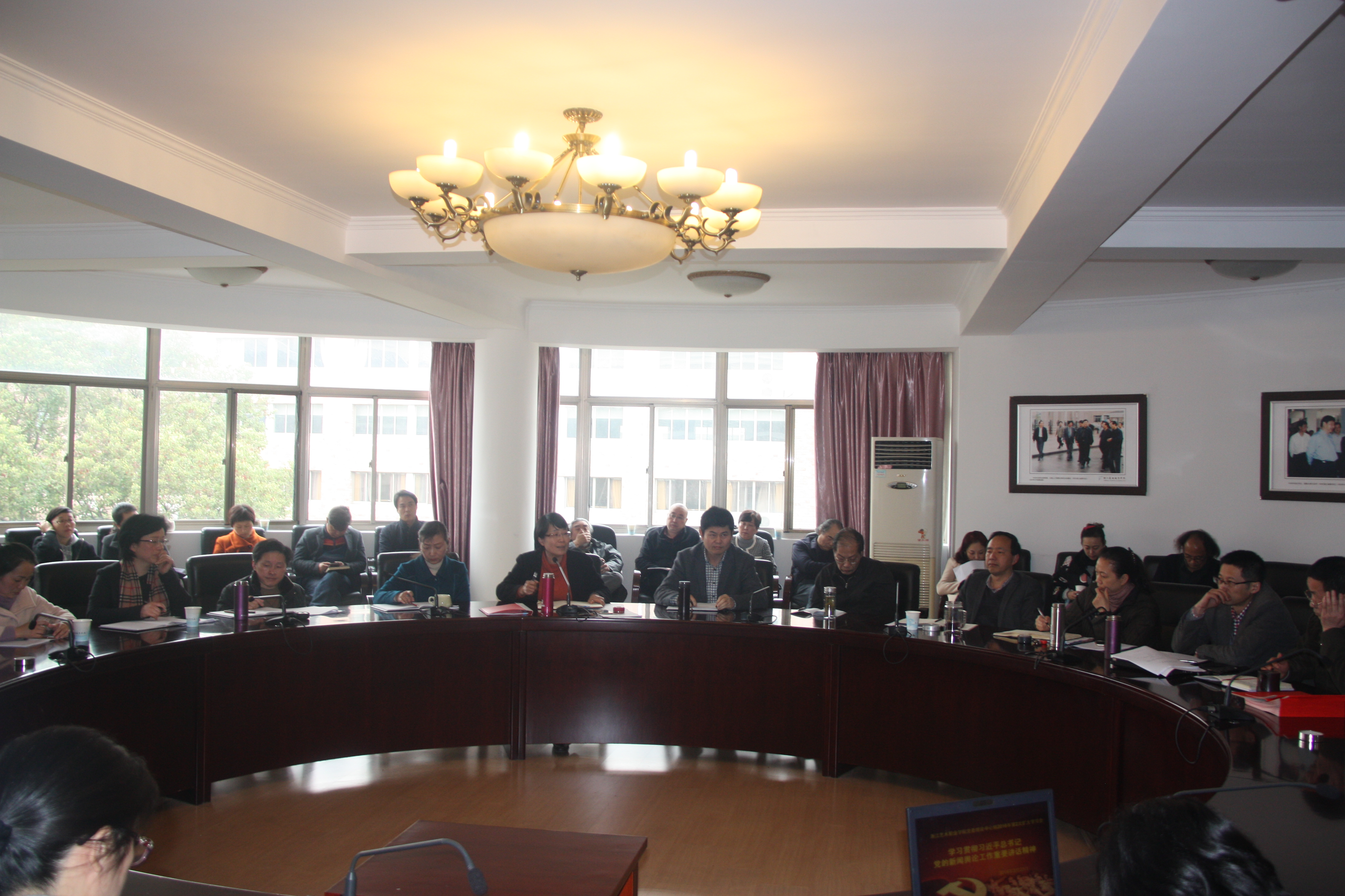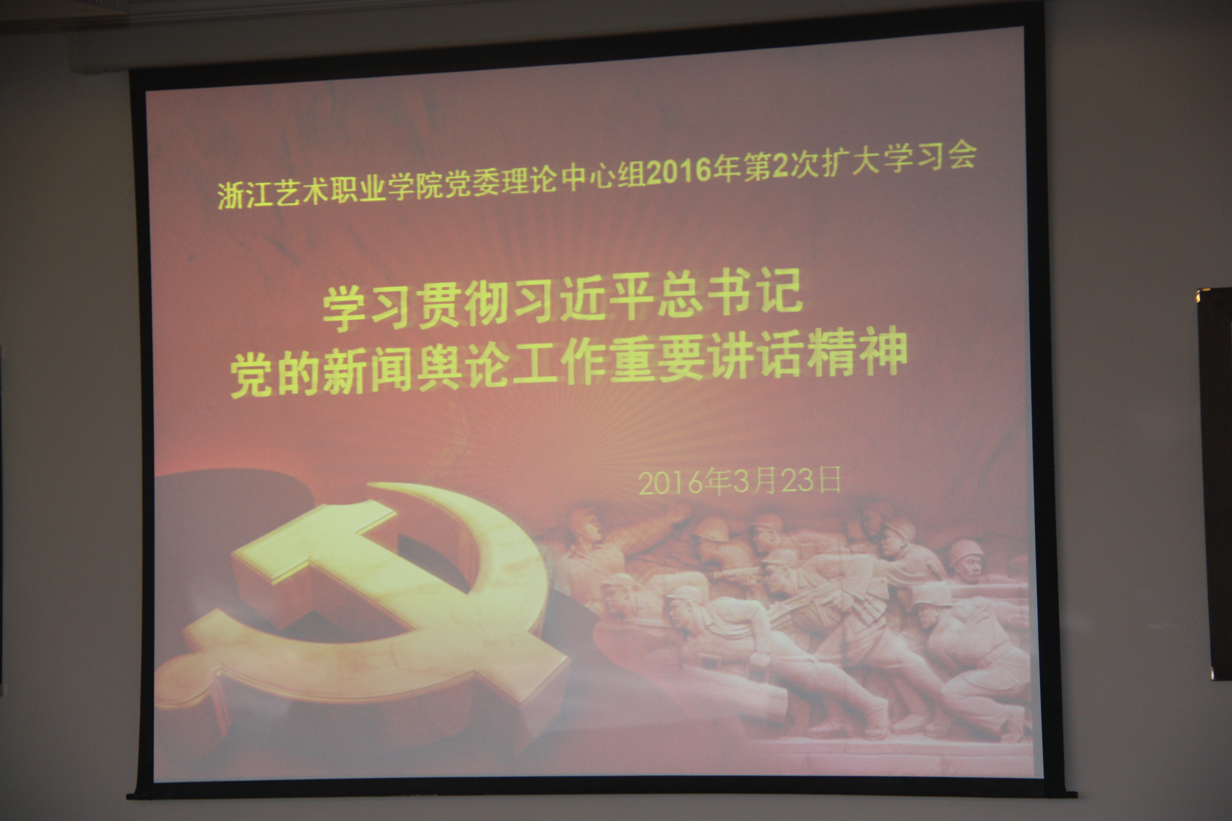 3月23日下午,浙江艺术职业学院党委理论中心组召开2016年第2次扩大学习会,传达贯彻习近平总书记在党的新闻舆论工作座谈会上重要讲话精神。院党委班子成员、全院副处以上干部参加扩大学习会。党委书记朱海闵朱海闵主持会议。
