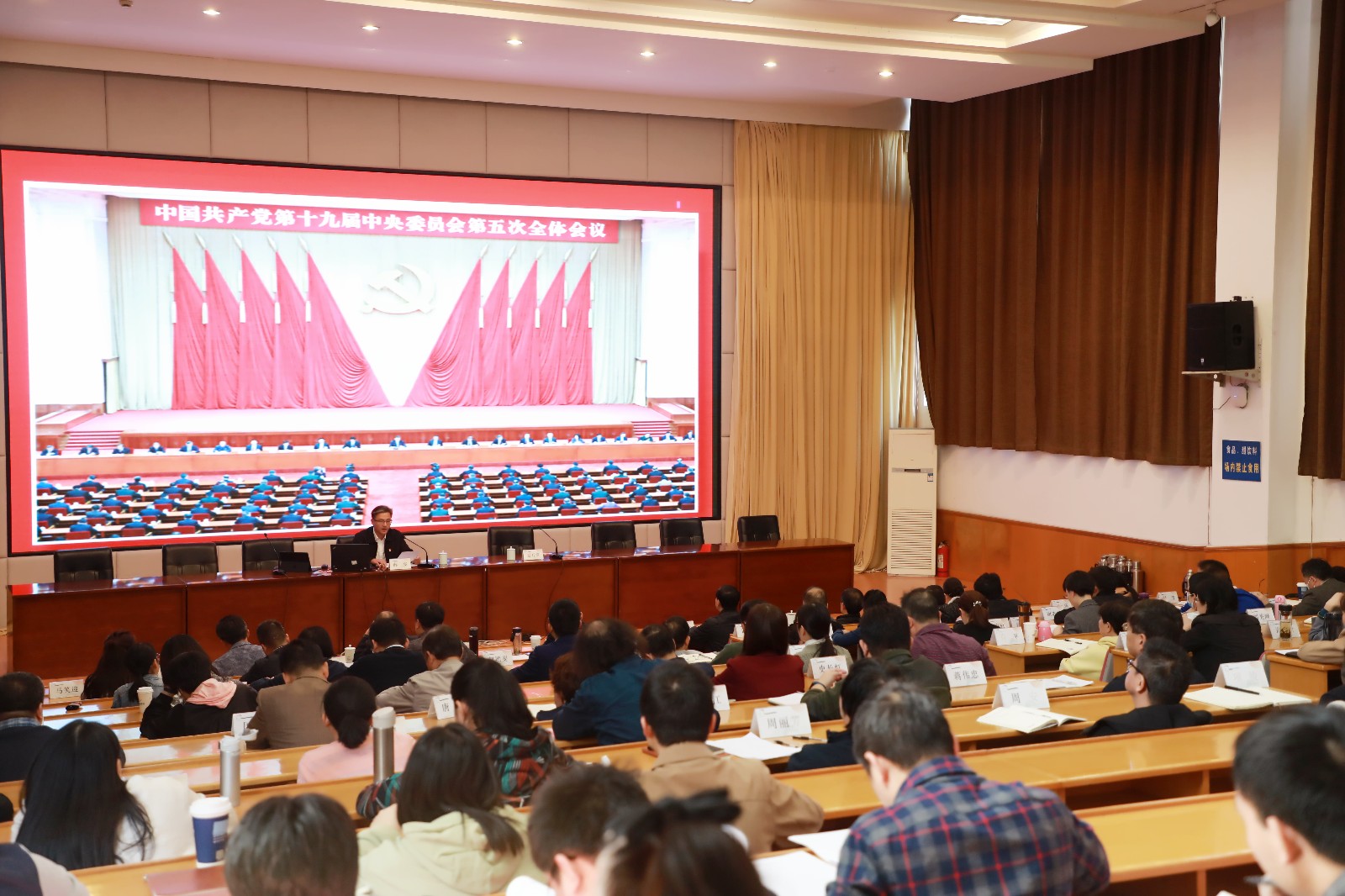 根据学校安排,10月30日上午,校党委班子成员、处科级干部和各单位教职工通过网络收看了中共中央新闻发布会,深刻学习和领会十九届五中全会精神,并畅谈感想体会;11月1日上午,我校组织干部师生集中收看了十九届五中全会新闻发布会的实况,当天下午,校党委理论学习中心组召开会议,传达学习党的十九届五中全会精神和全省领导干部会议精神。
