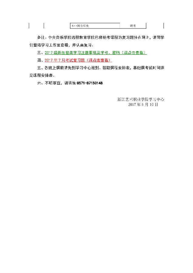 中央音乐学院远程教育2016-2017学年第二学期期末面授、考试安排(2017.6)