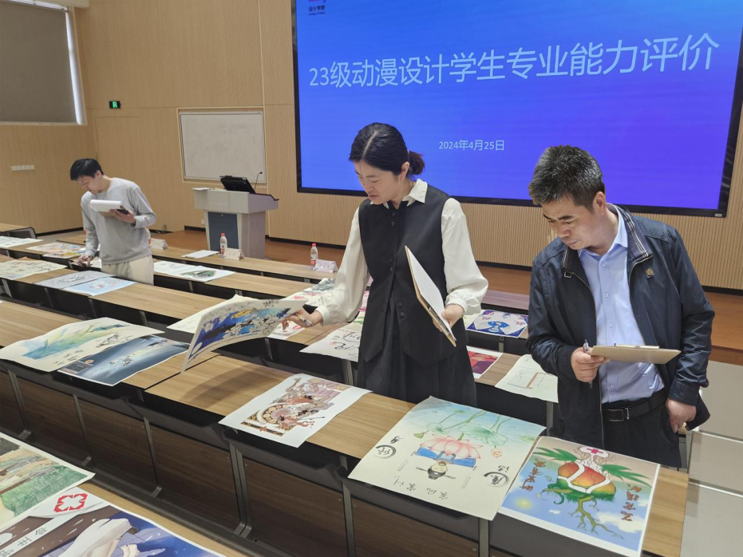 4月25日,针对此次学生专业基本功测试开展了相关作品评审工作,浙江省漫画家协会主席陶小明,副主席江健文,浙江机电职业技术学院副教授朱冬勇,设计学院副书记汪仕龙,副院长何佳玮,动漫设计教研室主任贾娜娜,专业带头人孙煜珑及全体专业教师参加评审工作。