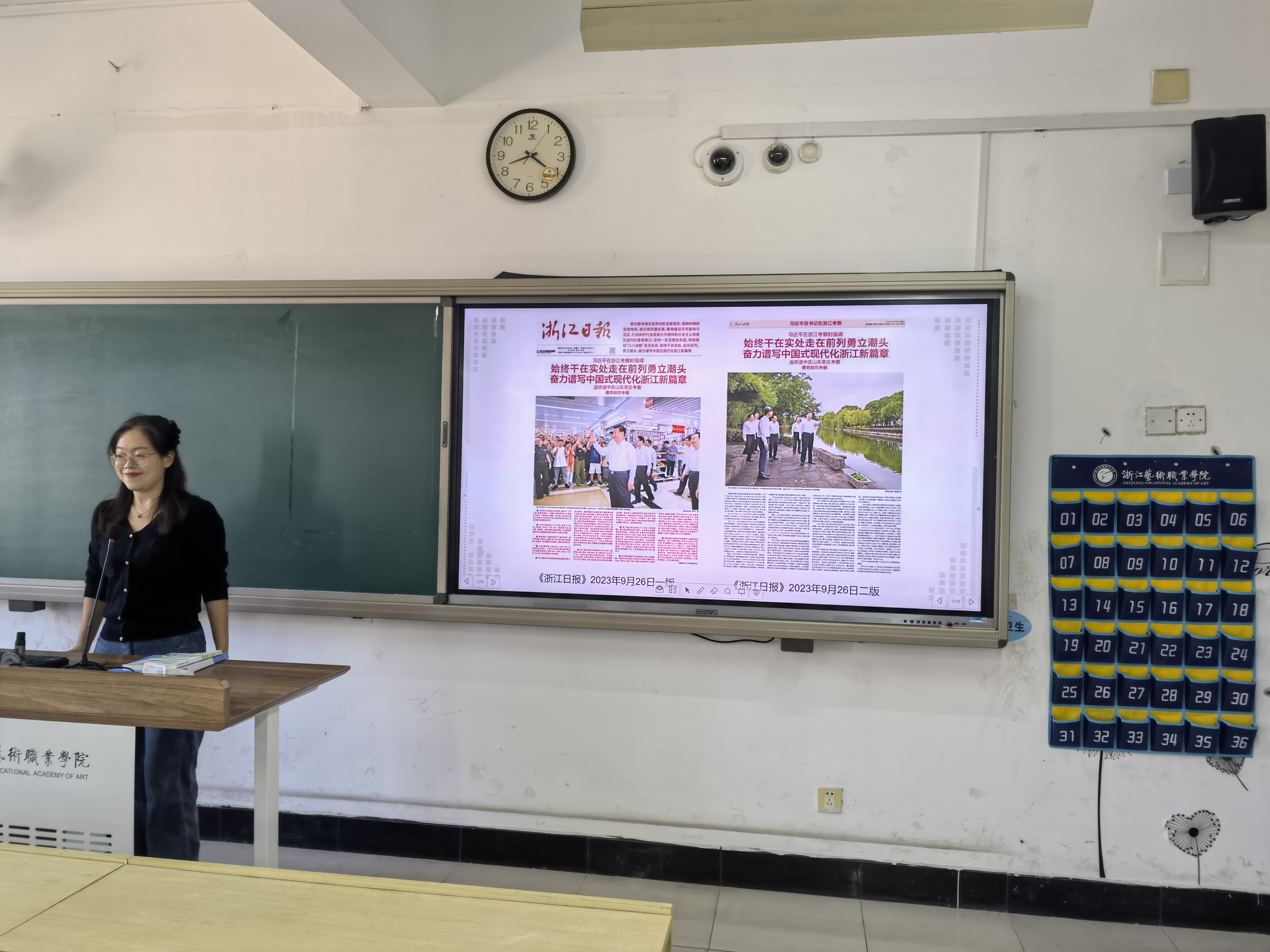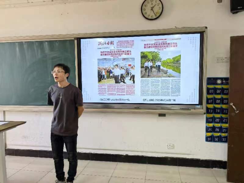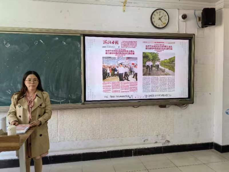 在老师的带领下,同学们共同阅读《浙江日报》2023年9月26日刊登的《始终干在实处走在前列勇立潮头 奋力谱写中国式现代化浙江新篇章》等报道,思政老师们也结合授课内容,对党报内容进行了深入浅出的解读,让学生们在熟悉又特别的情景和方式中熟悉党报、走进党报,引导学生进一步领会习近平新时代中国特色社会主义思想的世界观和方法论。