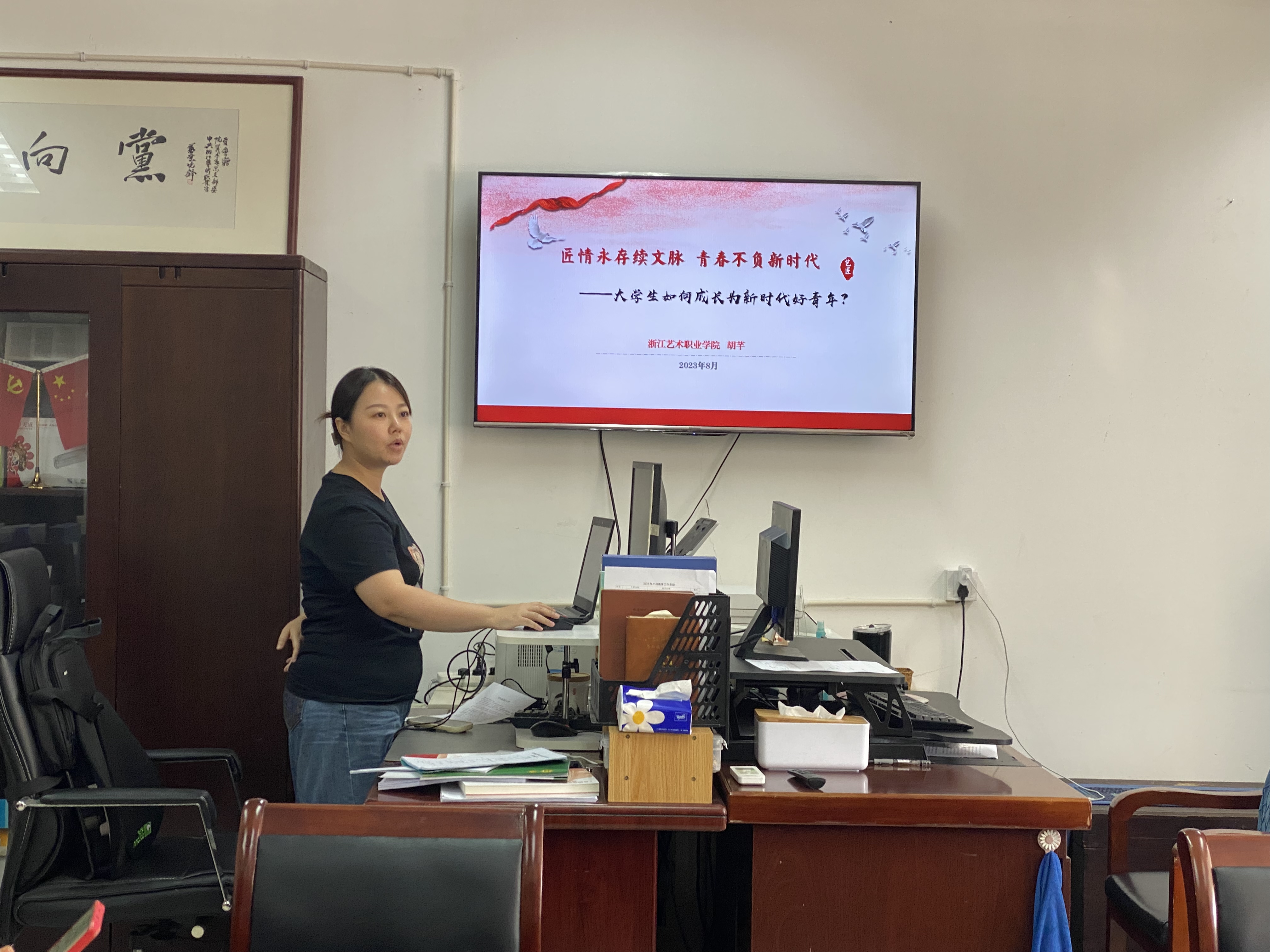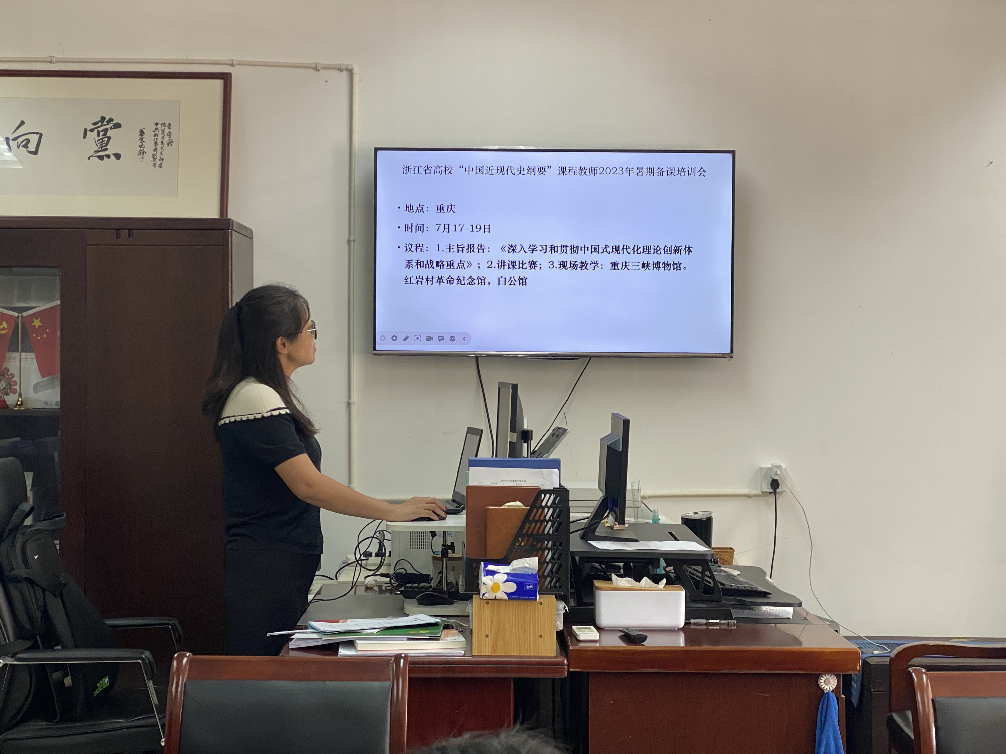 最后,胡卓群会对外出培训老师们的交流汇报内容给予充分肯定,此次分享会有助于在马院内部形成互帮互学、合作交流、成果共享、共同提高的良好风气,她强调思政教师积极参加培训不仅可以提升自身教育教学能力,更能促进马院整体教育事业发展,期望教师们珍惜培训机会,通过学习进一步熟悉政策、把握热点,结合浙艺特点,做到学习与思考齐行、理论与实践并重,不断突破自我、奋起直追,努力把暑期学习成效转化为推动思政课高质量发展的生动实践,赋能学校“大思政课”建设发展,共创马院新辉煌