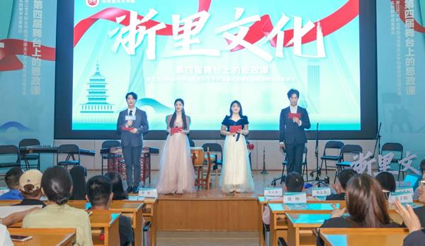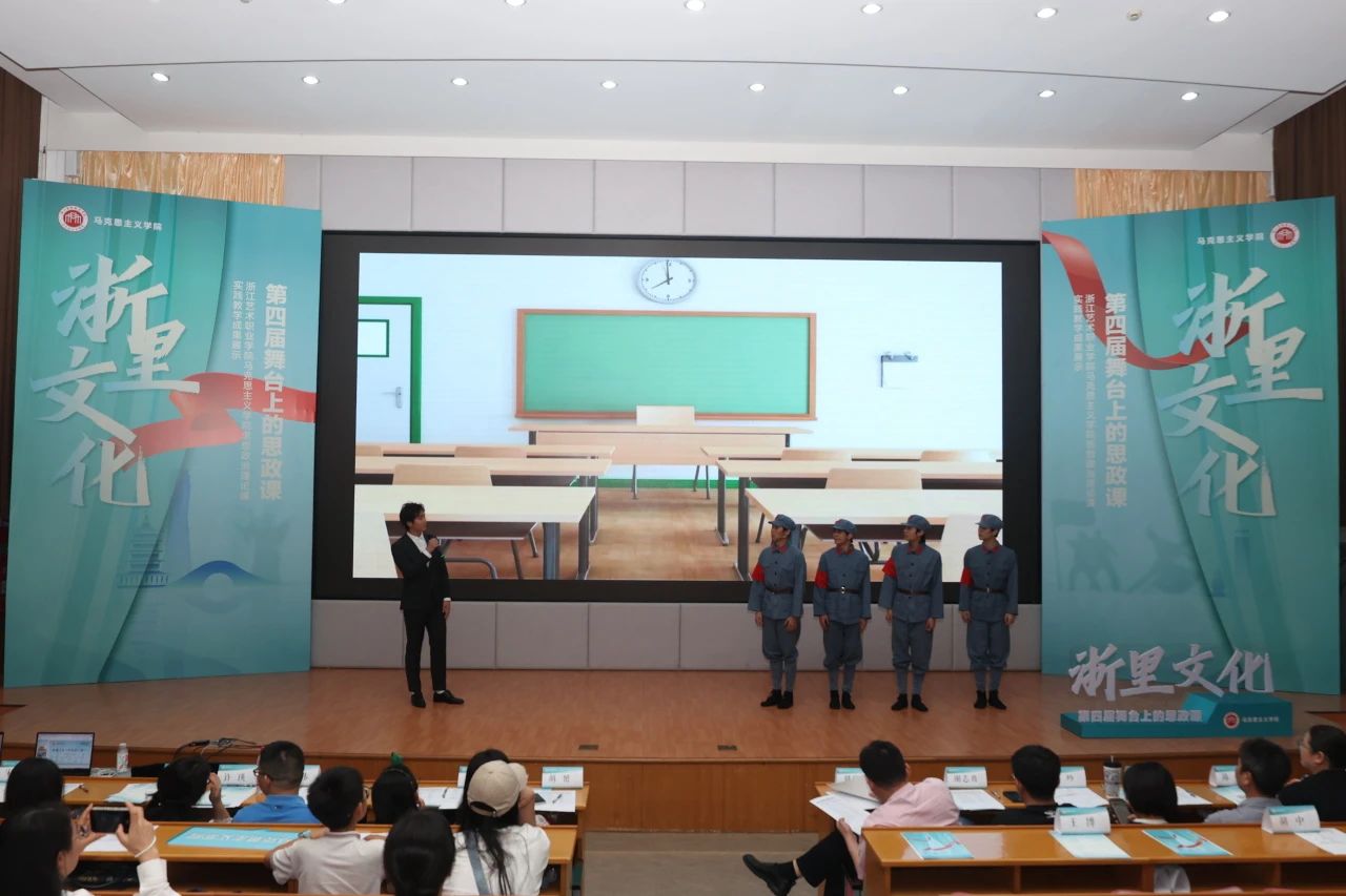 6月5日晚,“浙里文化·第四届舞台上的思政课”决赛展演暨思想政治理论课实践教学成果展示活动在图信中心举行。校党委委员、组织部部长、人才办主任周应中,宣传部、教务处、团委、各二级学院相关负责人,马克思主义学院领导班子和思政课教师担任评委。