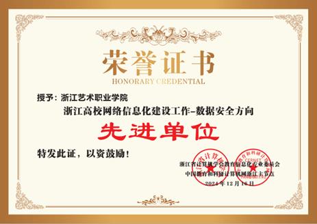 近日,浙江省计算机学会教育信息化专业委员会、中国教育和科研计算机网浙江主节点联合表彰了一批2024年高校网络信息化建设先进单位和先进个人。我校继2023年获浙江高校网络信息化建设工作 “网络安全”及“数字治理”两项先进单位荣誉后,2024年再获“浙江高校网络信息化建设工作-数字安全方向先进单位”、“浙江高校网络信息化建设工作-信息技术应用创新方向先进单位”两项荣誉,图书信息中心许衡老师被评为“浙江高校网络信息化建设先进个人”。