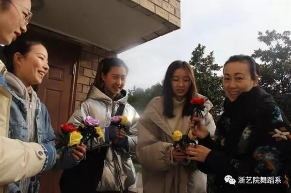 “老师来了,老师来了”一位同学急促地喊到,看到老师我们脸上立刻洋溢起灿烂的笑容,我们齐声高喊:“老师,女神节快乐!"老师也感受到学生的温暖,给了我们大大的笑脸,心中的幸福感都要溢出来了。同时其他系的老师们,看到我们的小花也特别喜欢,我们也走上前去把舞蹈系的祝福送给她们。遇到保洁阿姨们我们也毫不犹豫地将温暖带给她们,因为没有她们就没有我们干净整洁的练功房,也就没有我们好的学习氛围,所以在这一天,她们也是美丽的女神!