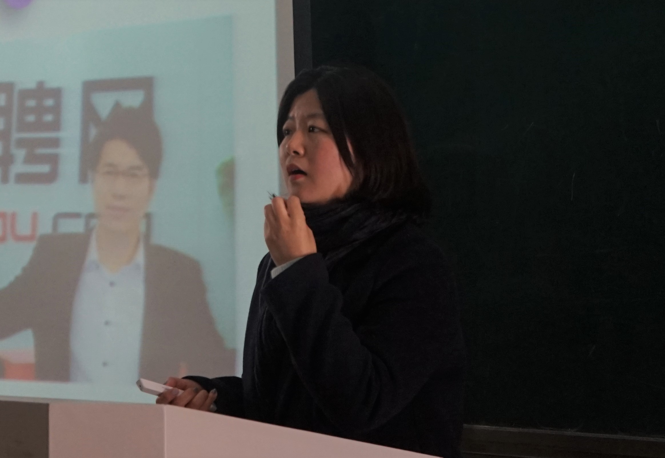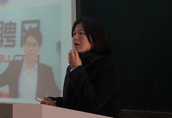 随后潘帆又以写作技巧为重点展开演讲。简历是敲门砖,是吸引HR的关键,学生们要用“写作”技巧获取工作机会。简历分为传统简历和创意简历。潘帆指出创意简历是关键所在,学生需要的是以视频、音频、HS、网页等形式呈现简历。她又以HR眼中的简历、普通的传统简历为例子,告诉同学们在简历制作中创意的重要性,并对同学们的艺术细胞给予高度肯定和期待。