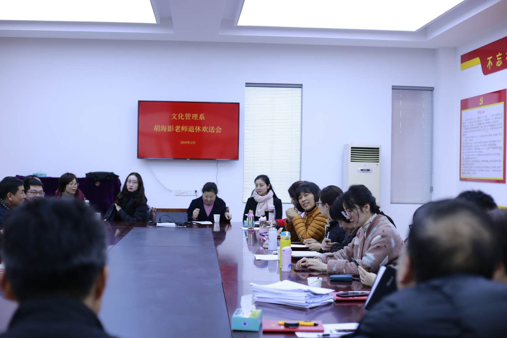 2月27日下午,文化管理系为胡海影老师举行退休欢送会,欢送胡海影老师光荣退休。学校党委委员、副院长沈军甫,校党委委员、组织部部长、人事处处长王涛出席欢送会,文化管理系全体教师参加会议,会议由系主任谢青主持。