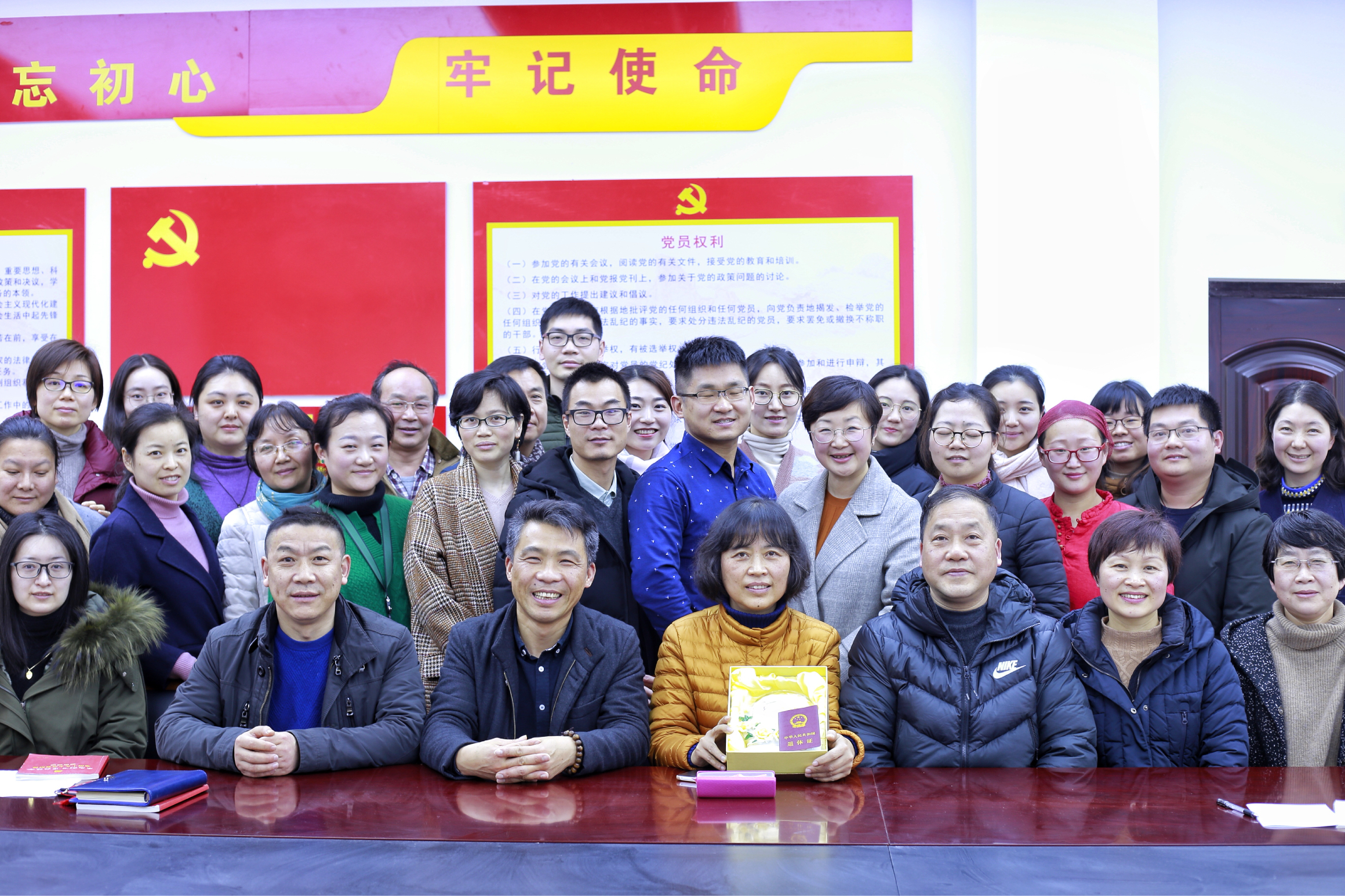 与会教师们纷纷祝愿胡海影老师身体健康,退休生活美满幸福。会议最后,沈军甫代表学校向胡海影老师颁发光荣退休荣誉证书并合影留念。