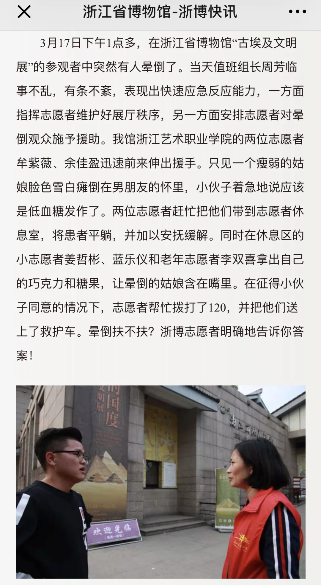 文化管理系的学生志愿者们则有的在图书馆内协助管理人员进行图书分类、上架摆放,协助小读者们养成良好的阅读习惯;有的在西湖美术馆的古埃及文明展向参观者们分发展览小册子、讲解关于古埃及文明的历史、象形文字、木乃伊等,使参观者更好的领略“法老的国度”;有的在名人纪念馆第二课堂给小朋友们介绍和示范如何拓印;有的在献血站为大家普及献血知识,为献血者们做好服务;有的在低碳科技馆内向游客进行低碳知识及展品的讲解,对展品进行操作演练或针对展品为观众提供咨询答疑服务等等。值得一提的是,我系18级民族传统技艺班的牟紫薇和余佳盈同学在古埃及文明展志愿服务时,还救助了一位晕倒的参观者,将其扶到志愿者休息室并加以安抚缓解,事后患者朋友专程赶回博物馆,表达了对志愿者由衷的谢意,浙江省博物馆还就此事进行了报道。