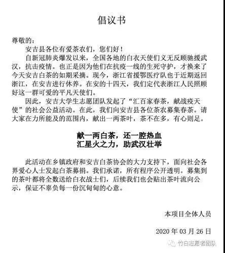 项目负责人联合安吉县志愿者协会向社会招募大学生志愿者,组建竹白志愿者团队;通过安吉县白茶协会向广大茶农、茶商募捐茶叶;向浙江洁美电子科技股份有限公司募集赞助……成功将一众人心意汇集到了一起。
