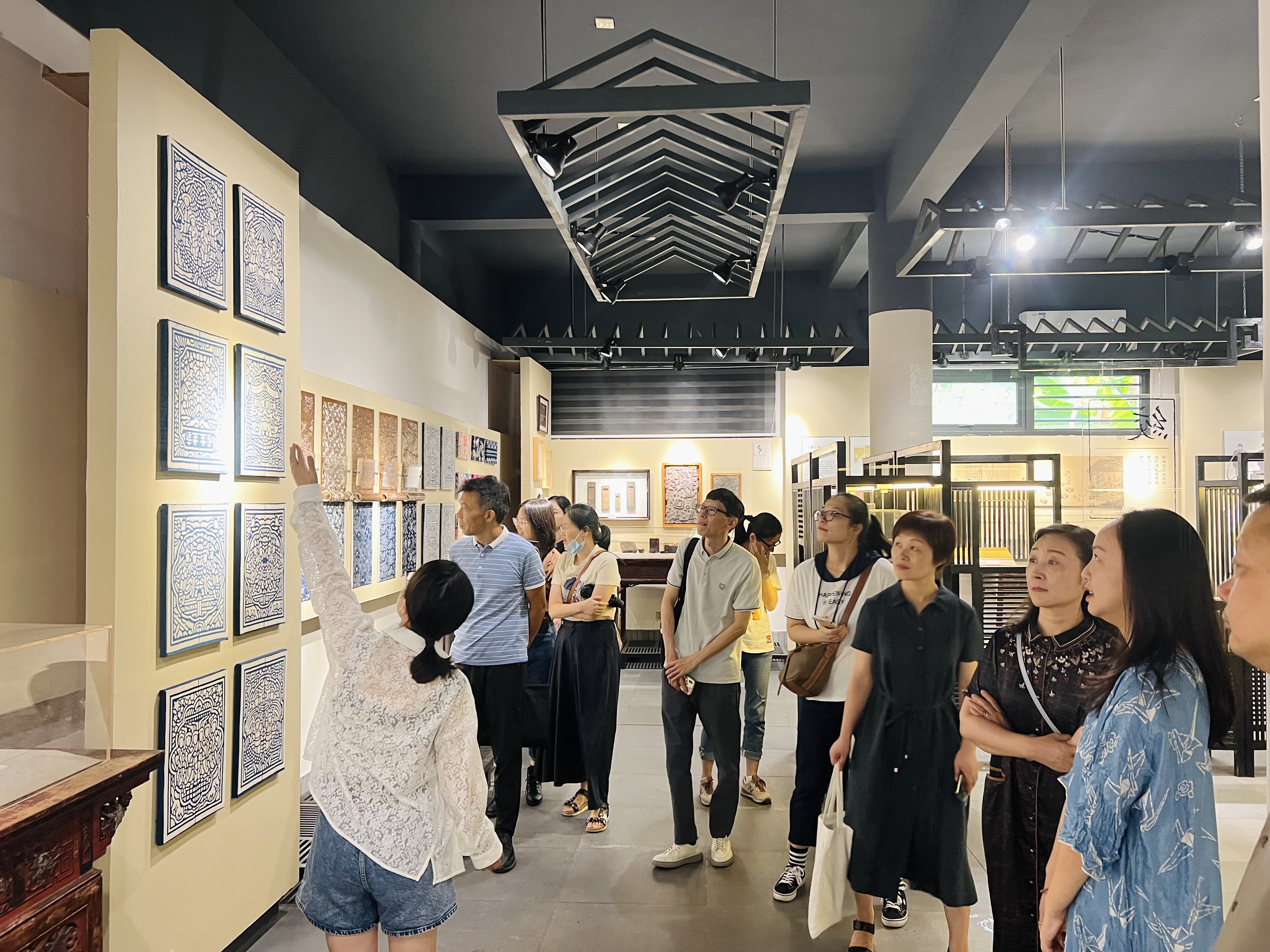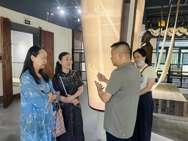 中国工艺美术大师、蓝印花布印染技艺省级代表性传承人、桐乡市丰同裕蓝印布艺有限公司总经理哀警卫带领浙江艺术职业学院教师一行参观公司及内部桐乡市非物质文化遗产馆蓝印花布分馆,体会蓝印花布印染技艺魅力。整个场馆占地22亩,设有蓝印花布展示馆、蓝印花布生产区、非遗传承教室、草木染色研究室、蓝印花布创意设计室、现代蓝印花布产品衍生区等。场馆中陈列了丰同裕历史资料及蓝印花布实物档案,蓝印花布的起源和发展脉络清晰可见,由古及今,眺望未来。
