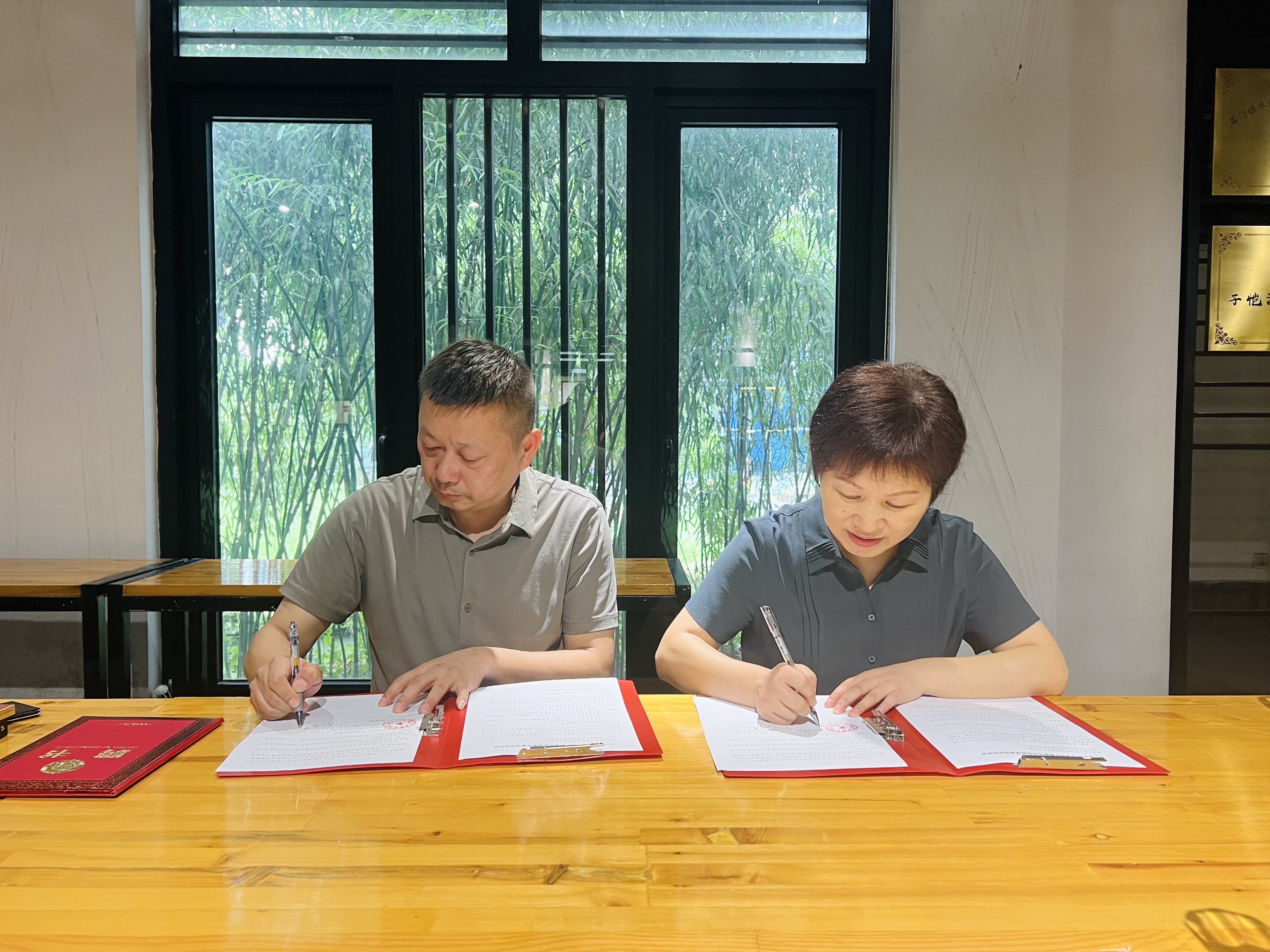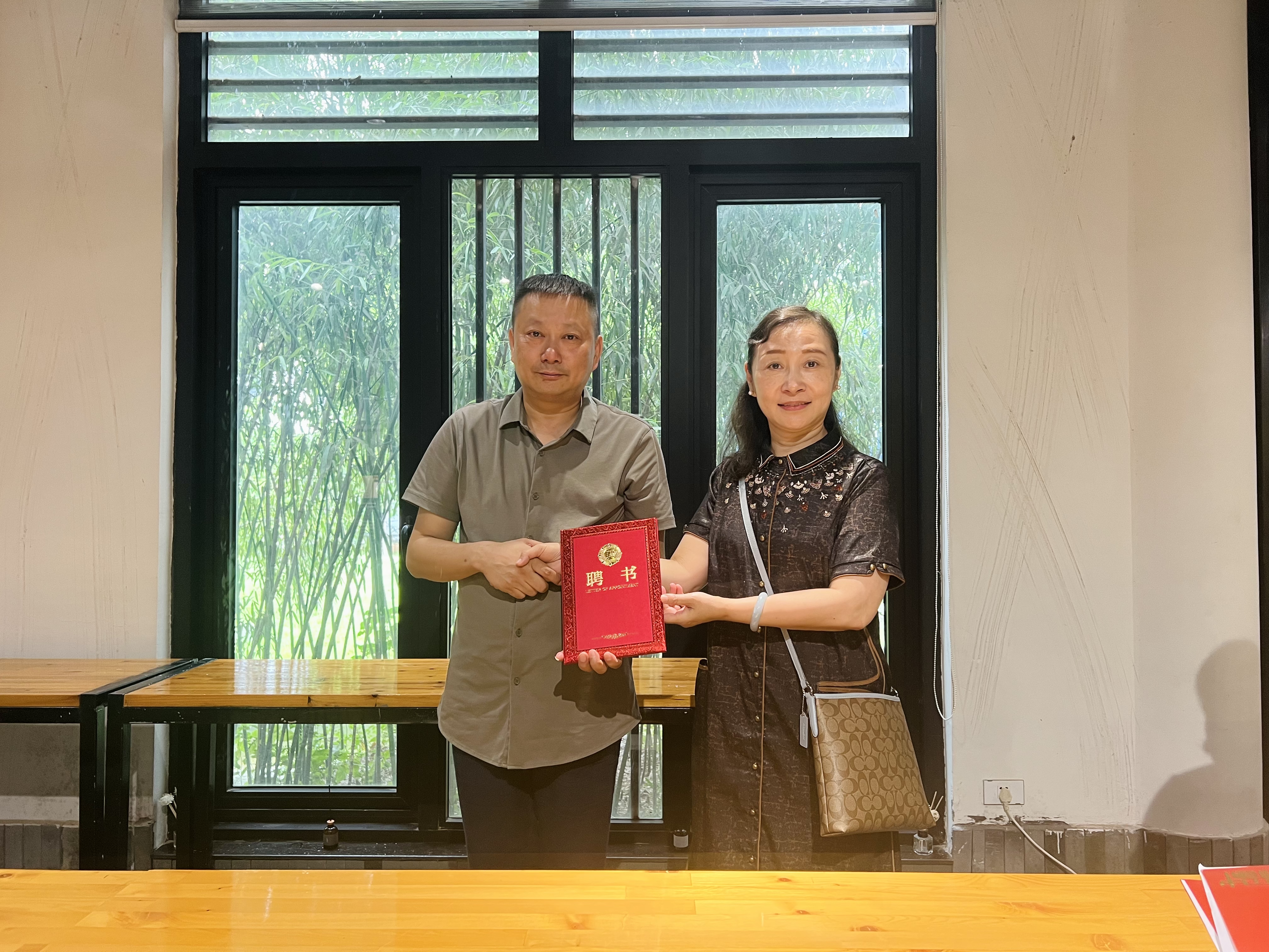 黄杭娟为哀警卫颁发浙江艺术职业学院特聘教授证书,手工艺学院党总支书记、副院长金银琴与哀警卫签订产教融合实践教学基地协议。此次协议签订,双方将在人才培养、专业建设、社会实践等协同开展务实合作,不断提升非遗保护水平,续写创新性保护传承、多样化融入生活的新篇章。