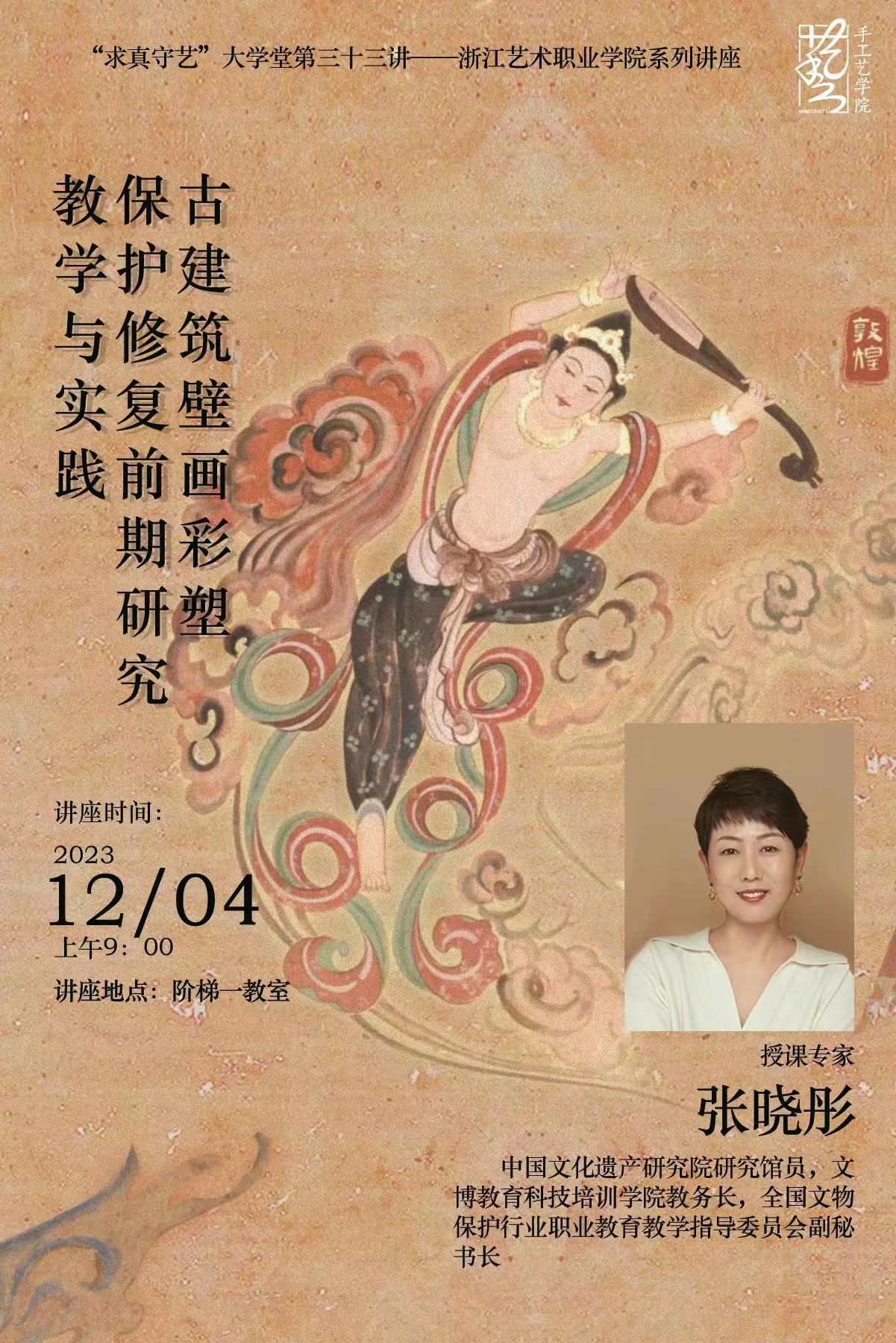 为了解古建筑壁画彩塑的保护与修复,拓宽对文物保护的视野和认知。12月4日上午,手工艺学院开展了“求真守艺”大讲堂第33讲专题讲座活动,特邀中国文化遗产研究院研究馆员,文博教育科技培训学院教务长,全国文物保护行业职业教育教学指导委员会副秘书长张晓彤带来一场题为《古建筑壁画彩塑保护修复前期研究教学与实践》的专题讲座,讲座由文物修复与保护教研室主任潘文娟主持。