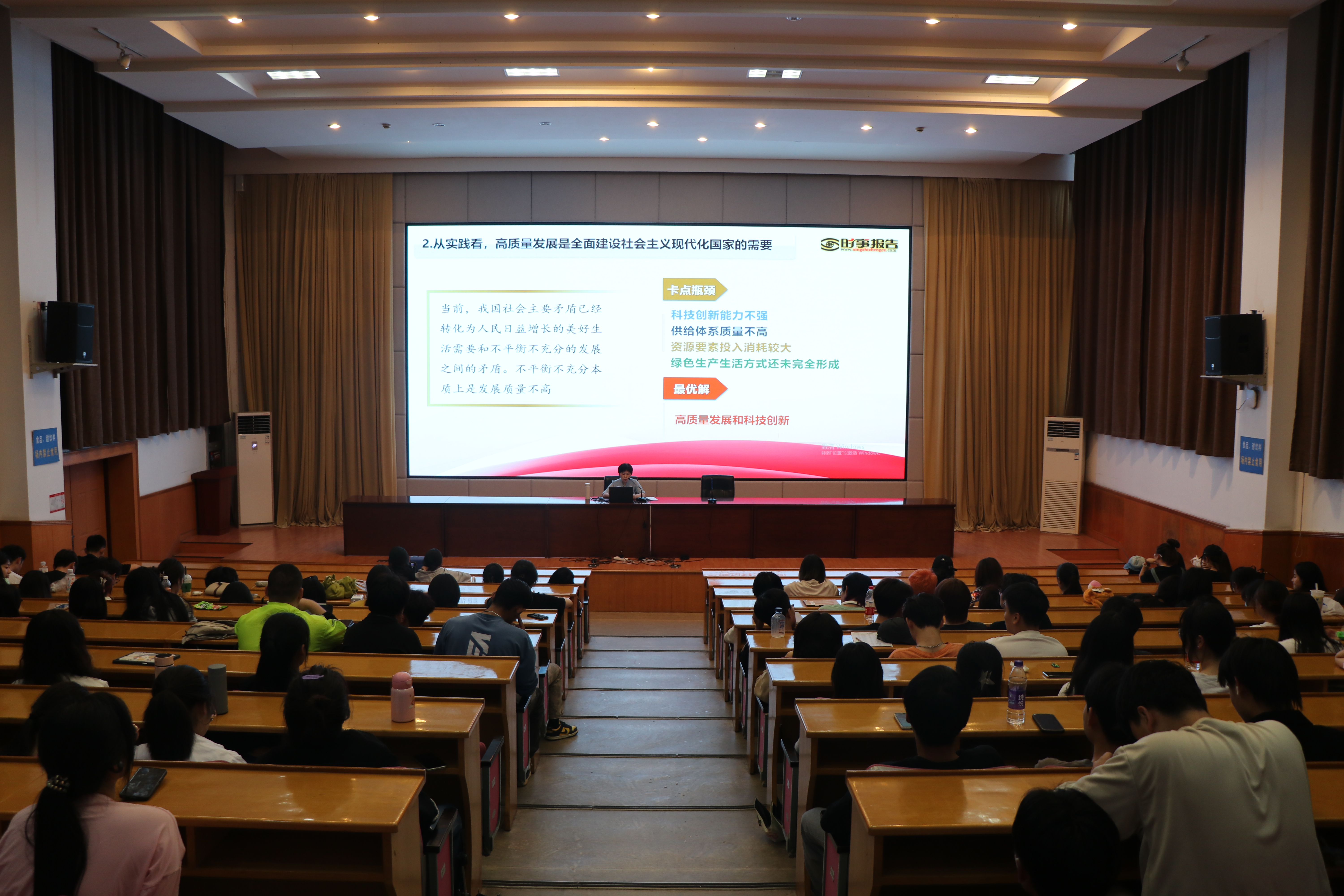 金银琴围绕党的二十大报告强调的“高质量发展是全面建设社会主义现代化国家的首要任务”,从高质量发展是全面建设社会主义现代化国家的首要任务、高质量发展深刻丰富的内涵要求、推动高质量发展作出的战略部署等方面展开讲解,让同学们深刻认识到高质量发展不只是一个经济要求,而是对经济社会发展方方面面的总要求,不是只对经济发达地区的要求,而是所有地区发展都必须贯彻的要求,不是一时一事的要求,而是必须长期坚持的要求。