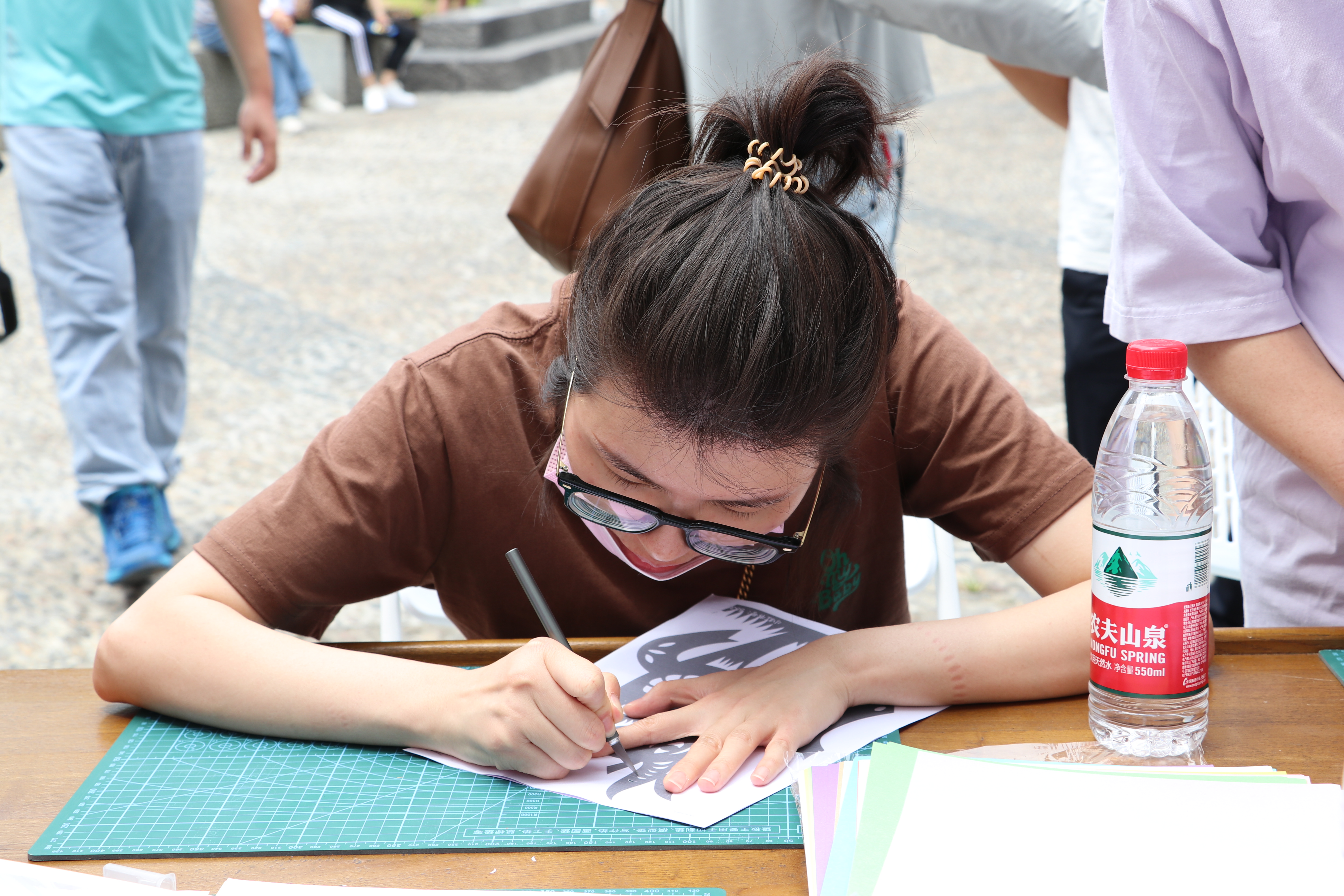 在水印木刻的摊位上,艺小匠同学详细示范了木版水印画的印制步骤,在他们的指导下,体验者们有模有样地将蘸取墨水的刷子在木版上刷色,仔细地均匀涂抹版面,观察好版面的位置后,把宣纸对准印版平铺,借助马莲在平铺的纸上来回旋转摩擦,使纸面和版面上的墨充分接触。