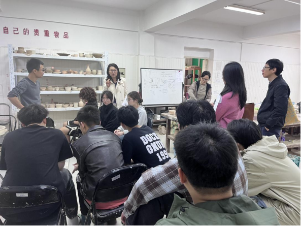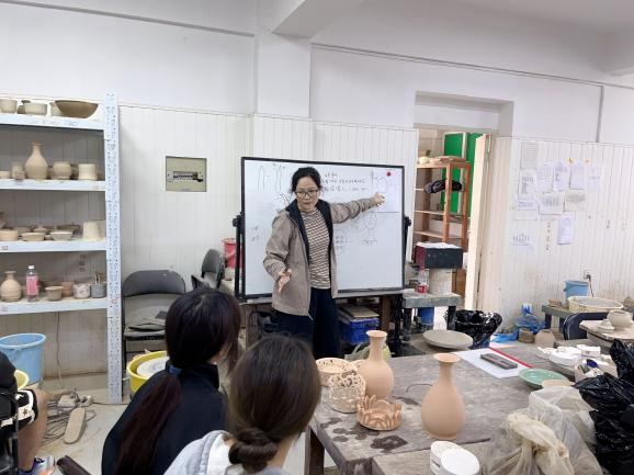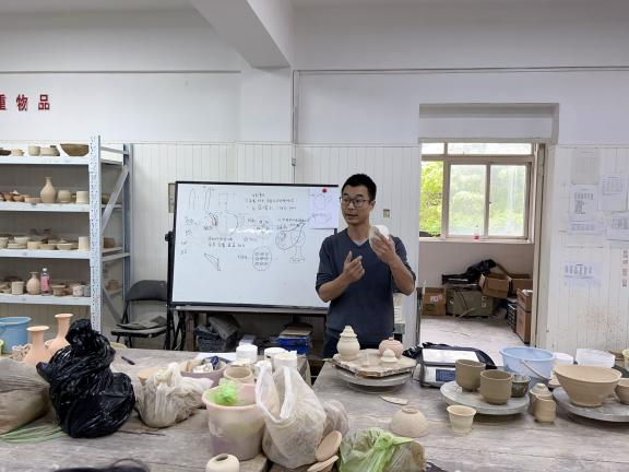 课程中,授课老师傅菲菲和郑源雷从茶文化和茶具的历史发展切入,通过现场示范和讲授的模式,借助残器标本向学生们阐释茶具制作的重难点,引导学生从“用”和“美”的角度出发,创作出符合当代审美和实用价值的茶壶器具。