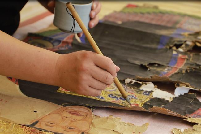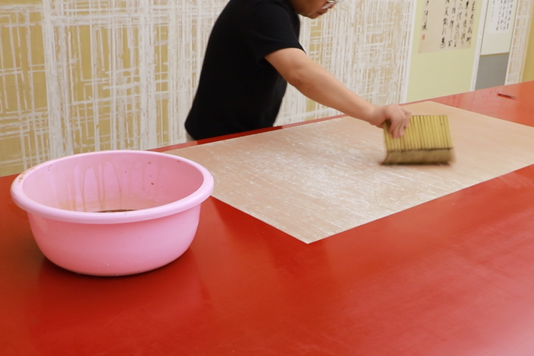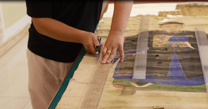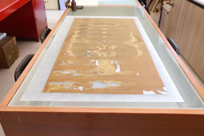 第二,清洗过程因为画心霉烂、糟朽、掉色等原因,纸质极为脆弱,故先要对脆弱部分进行加固、固色等操作,用开水进行淋洗,去除画芯上的霉斑、污渍,清洗过程需要极其细心,动作要轻。