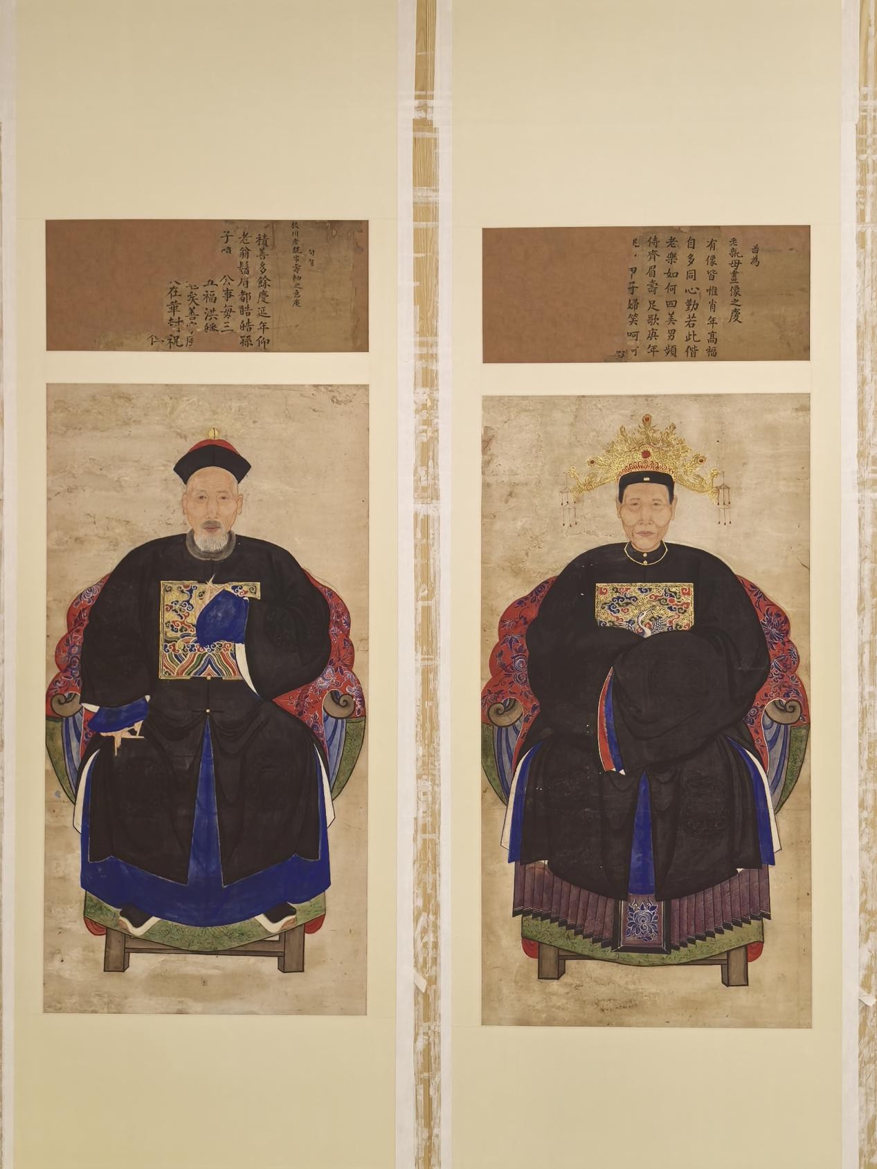 两件需要修复的画像为仙居县溪港乡塘弄村王氏家族所藏清代画像,因年代久远加保存不当,画像出现了霉烂、糟朽、絮化、脆化、掉色、断裂、虫蚀等病害,已不适合长期保存与展示,故需进行紧急修复。画幅装裱形式为传统手工纸镶绫边,均伴有大面积糟朽及缺失,两幅画像天头画赞处均大面积缺失,仅存右边一半,画幅有多处折痕及贯穿伤,因保存不当受潮后大面积滋生霉菌,颜料极易剥落,在前期的保存过程中背后有使用过大面积化工胶水及多层A4纸叠粘,整个修复过程难度较大。