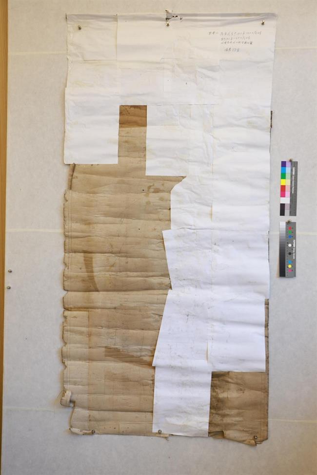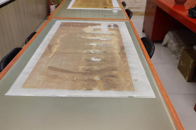 本次修复经过除尘、去霉→颜色加固→拆除原有裱件→加固→清洗→染制命纸→揭画芯→颖补→贴折条→打胶矾水→抻平→全色→装裱等过程,耗时较长。