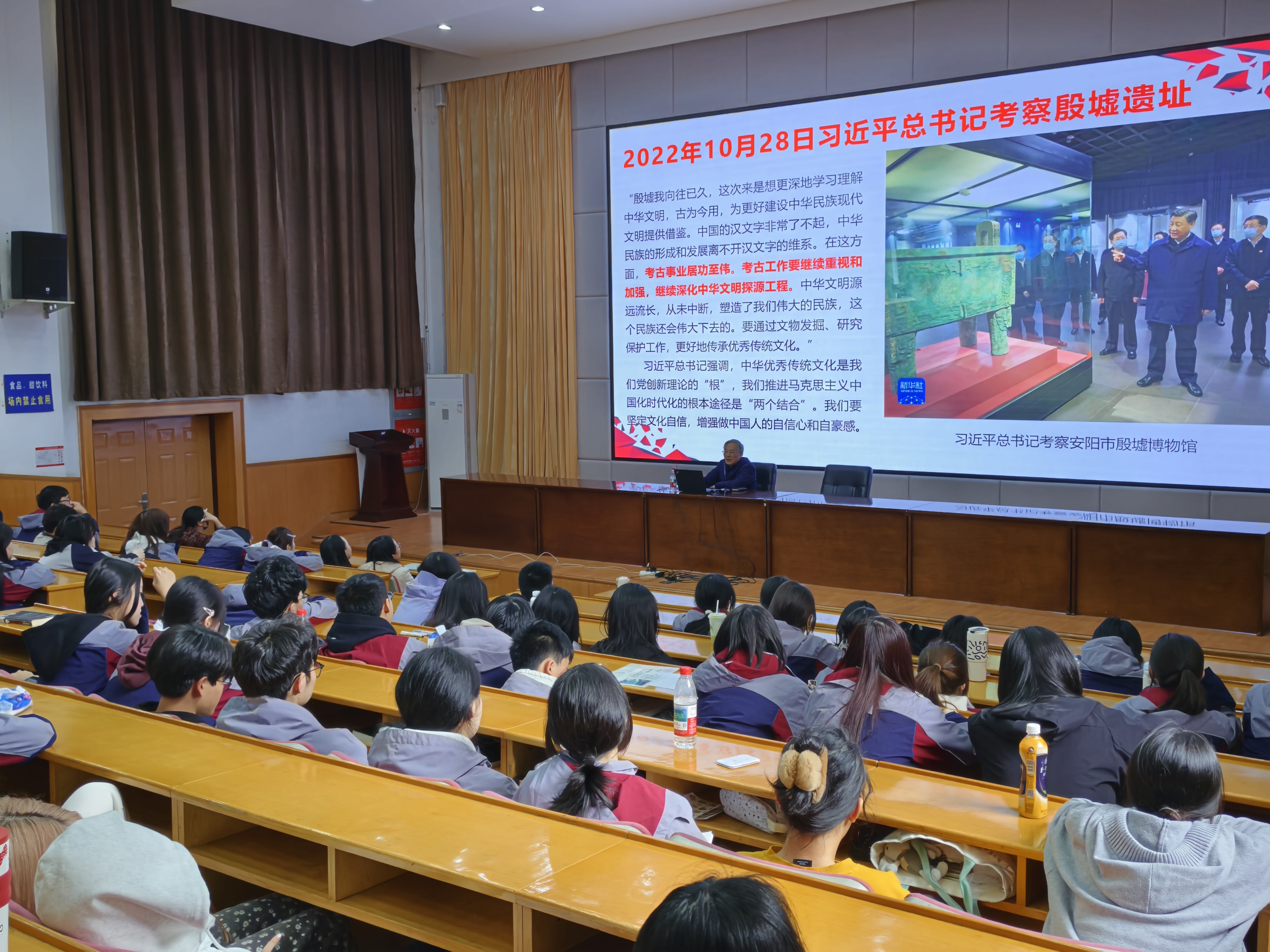 讲座伊始,杨建武围绕国家层面对考古与文物保护的战略部署展开讲解。他结合中央关于中华文明探源工程的重要指示,清晰阐释“考古工作是揭示中华文明起源、发展脉络和灿烂成就的核心途径,是增强文化自信的重要支撑”这一核心观点,让在场师生对文物保护事业的时代价值有了更为清晰的认识。