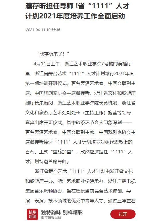 开班仪式的举行,也标志着浙江省舞台艺术“1111”人才计划这一浙江省文化和旅游厅推出的重要人才工程2021年度培养工作全面启动。2021年度培养工作将紧紧围绕“聚焦经典、守正创新”的主题,通过学习经典、探讨经典、观摩经典、演绎经典等方式,从经典中汲取养分,创作并演绎具有“精神高度、文化内涵、艺术价值”的扎根本土、深植时代的文艺作品。2021年度将放眼全国,带领培养对象采风学习、邀邀顶尖导师开展教学、结合优质艺术资源集中组织多场高端剧目观摩等,同时进一步强化宣传力度,用专场讲座和综合演出等形式向社会汇报培养成果。
