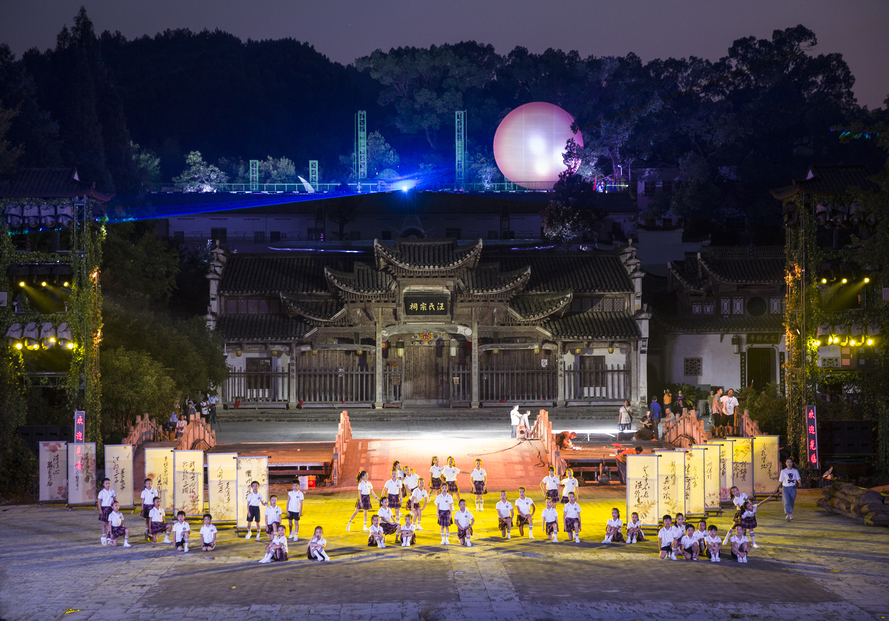 “咣——”清脆的锣声打破夜晚的宁静。灯光汇聚处,只见一男子左手持锣,右手持槌,高声朗诵:“派由大坂,族衍须江,文光射斗,六州保障,汪氏宗祠,掌灯——”几盏红灯笼霎时亮起,依稀映照出汪氏宗祠绵延300年的背景。