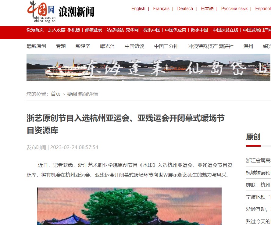 近日,记者获悉,浙江艺术职业学院原创节目《水印》入选杭州亚运会、亚残运会节目资源库,将有机会在杭州亚运会、亚残运会开闭幕式暖场环节向世界展示浙艺师生的魅力与风采。