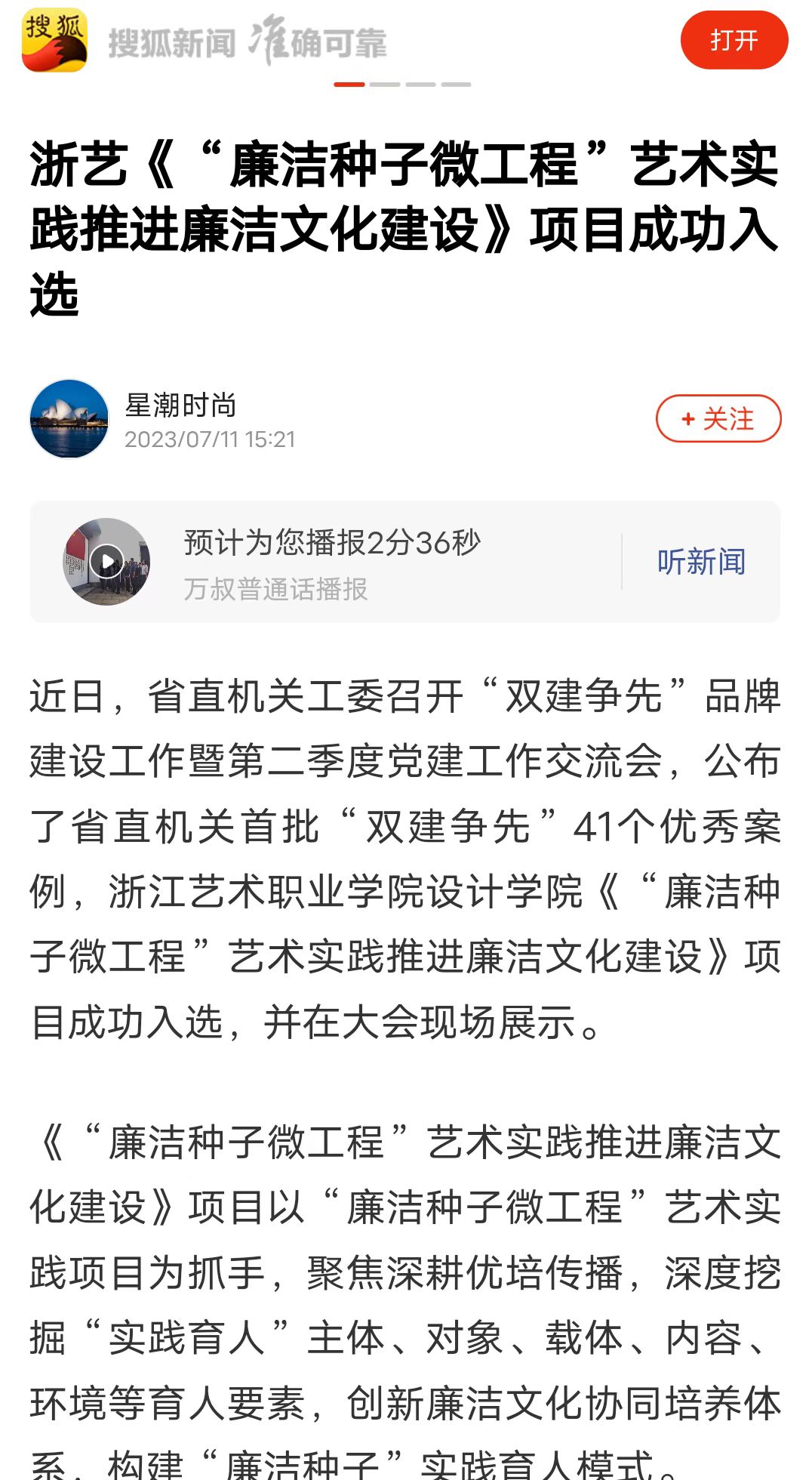 搜狐新闻:浙艺《“廉洁种子微工程”艺术实践推进廉洁文化建设》项目成功入选