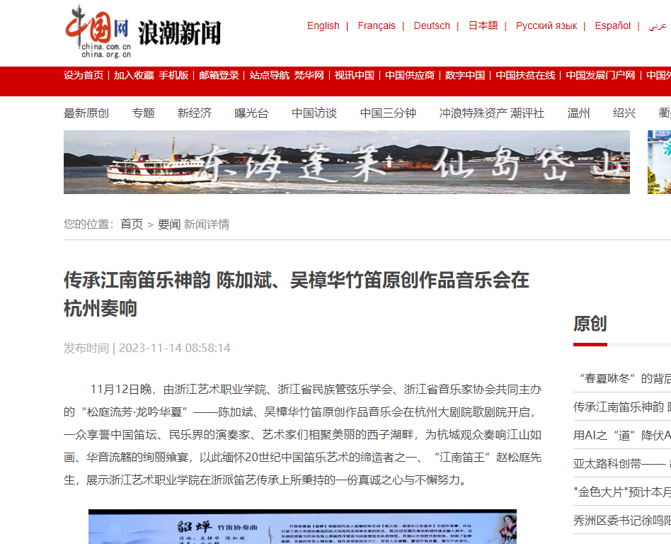 中国网浪潮新闻:传承江南笛乐神韵 陈加斌、吴樟华竹笛原创作品音乐会在杭州奏响