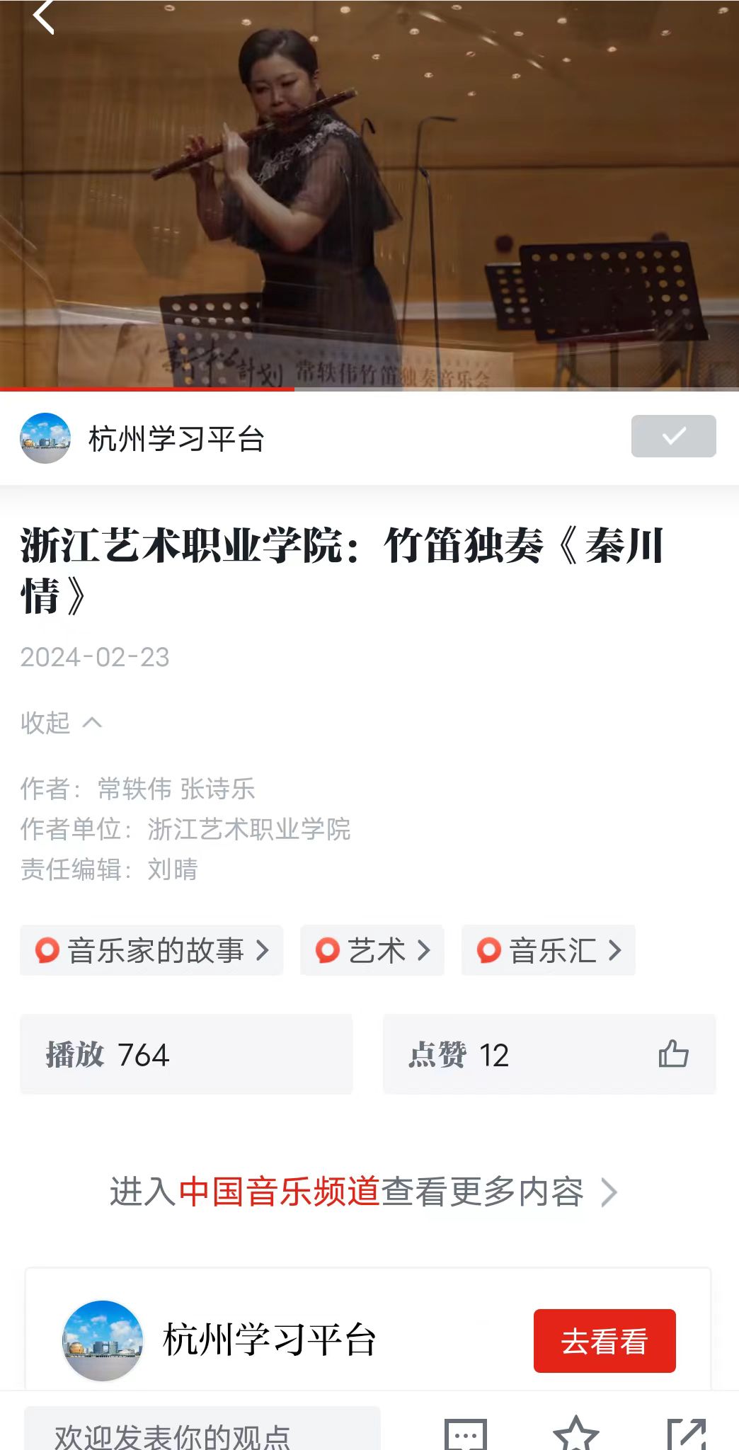 学习强国全国平台:浙江艺术职业学院:竹笛独奏《秦川情》