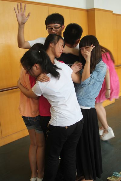 “一个也不能少”,这个心理小游戏的游戏规则是事先在地上铺一张报纸,要求6个同学都要踩在上面,不能漏掉任何一个人。游戏活动期间,笑声不断,精彩不断。看大家游戏时欢快的表情,似乎都忘记了白天疲劳的训练。