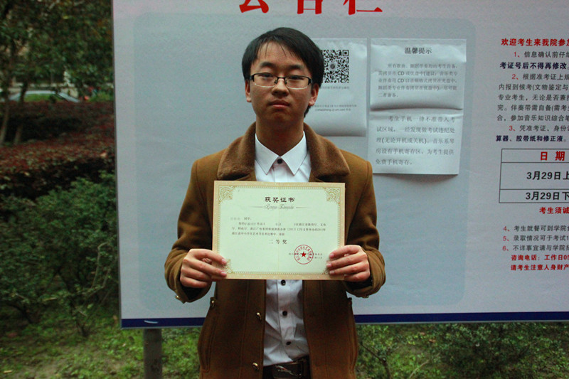 白白的皮肤,一副金边眼镜,满脸的书生气。从小热爱文物,喜欢画画的沈唐尧同学,面对学生记者的采访时,还是有些羞涩。被问及这一次文物鉴定专业的素描考试放在晚上进行时,他表示毫无压力,甚至还觉得夜晚的灯光更适合他的发挥。话匣子打开后,他还向大家展示了他在2013年浙江省中小学生艺术节美术比赛中《家园》的平面设计获省二等奖的获奖证书。
