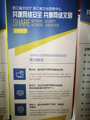 6月19日,浙江省文化系统“共建网络安全 共享网络文明”网络安全法宣传教育巡展活动走进我院,在8号楼大厅开展相关法律知识的展览,这是继6月1日《中华人民共和国网络安全法》正式施行之后,我省文化厅在文化系统内进行的一次为加强网络安全意识和法律意识的普法活动。