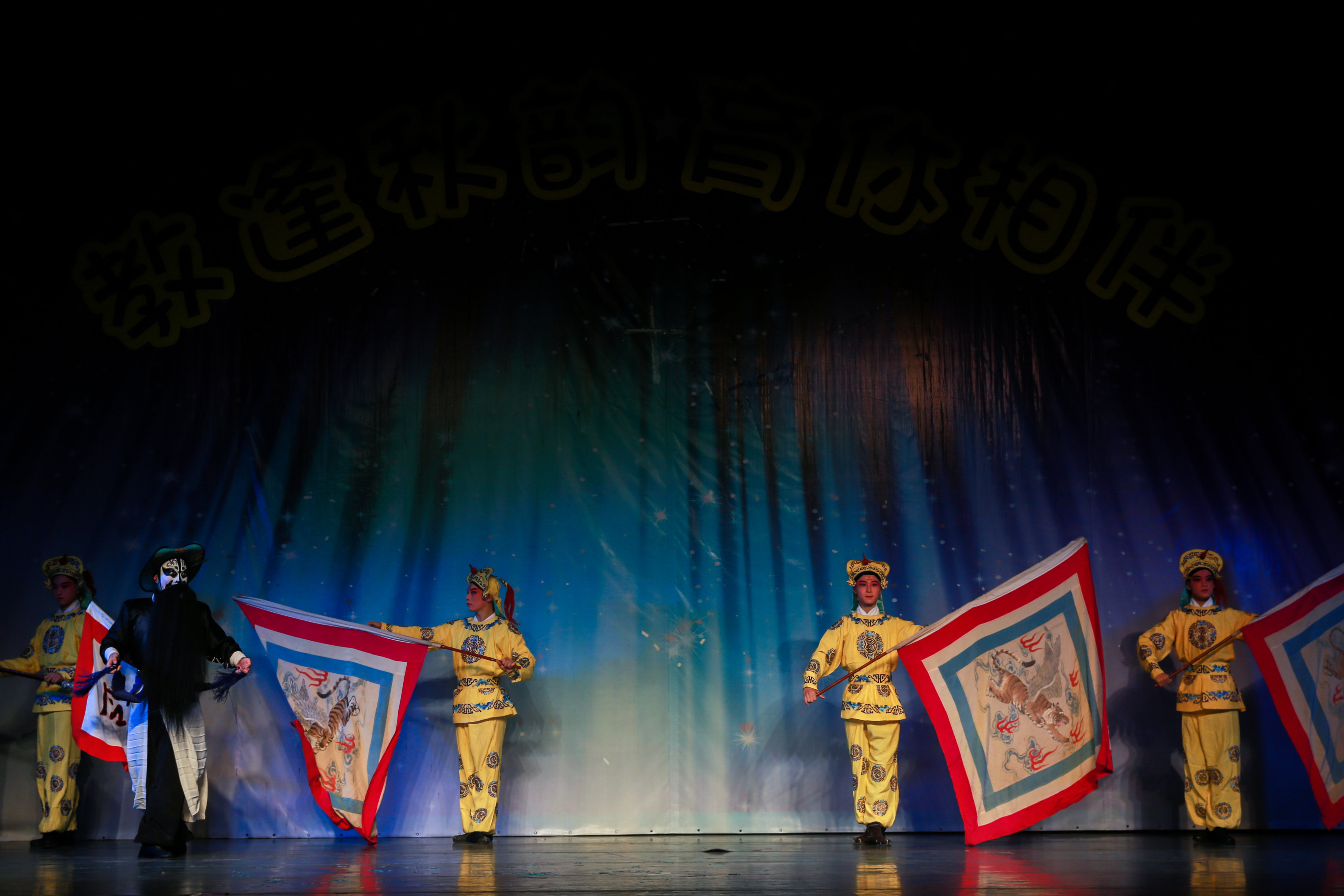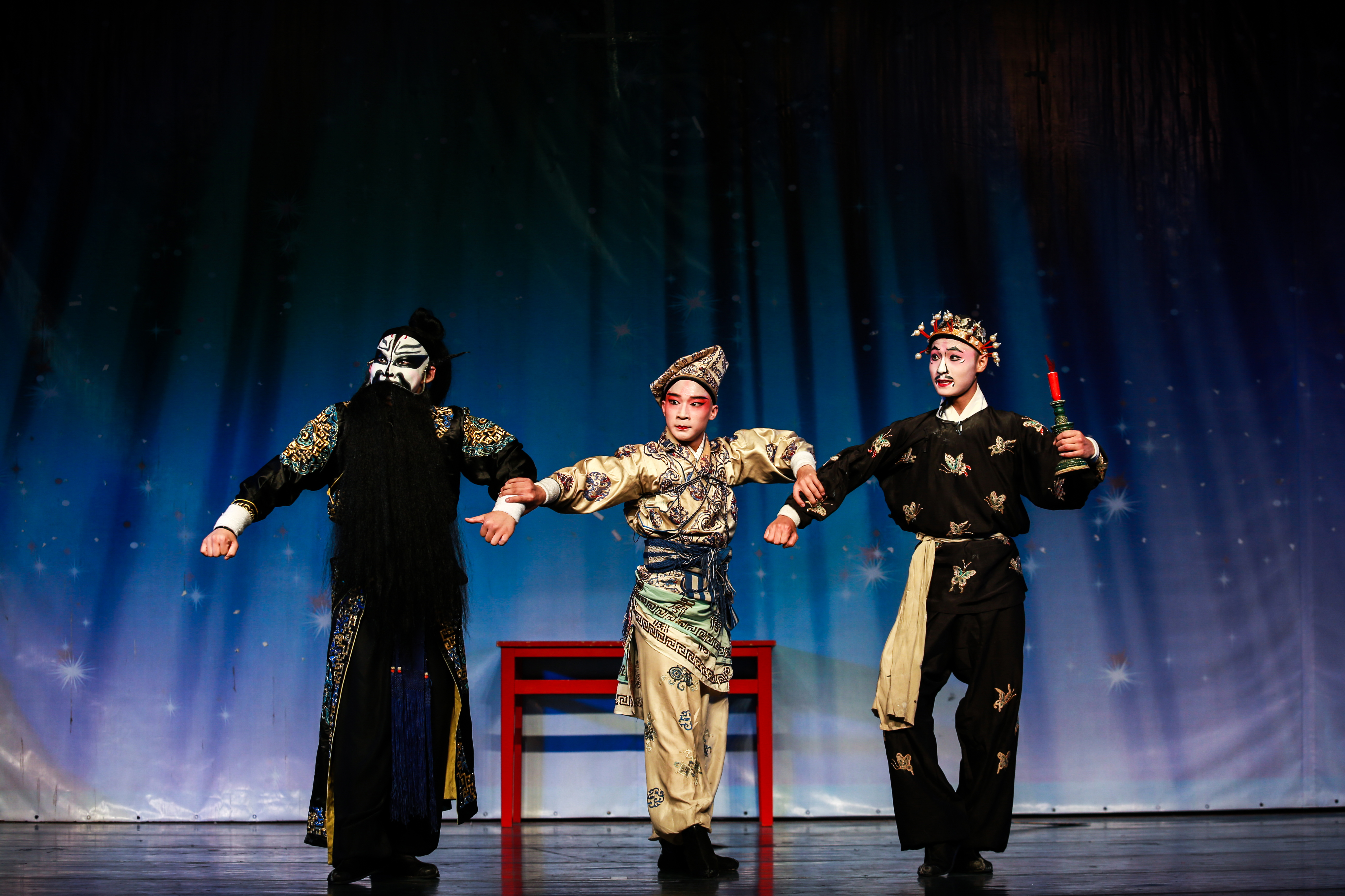 传统短打武生剧目《三岔口》拉开了演出的帷幕。故事讲述宋朝年间,焦赞因杀死谢金吾而被发配到沙门岛,途中住进刘利华店中。任堂惠奉命暗中保护焦赞,也住进此店。夜间,任刘双方发生误会,一场恶战在黑暗中展开,焦赞出面,方解此围。剧情中因为身处黑夜,饰演任刘二人的演员用形象的表演将摸黑搏斗的情态表现了出来,引发了同学们的阵阵笑声。