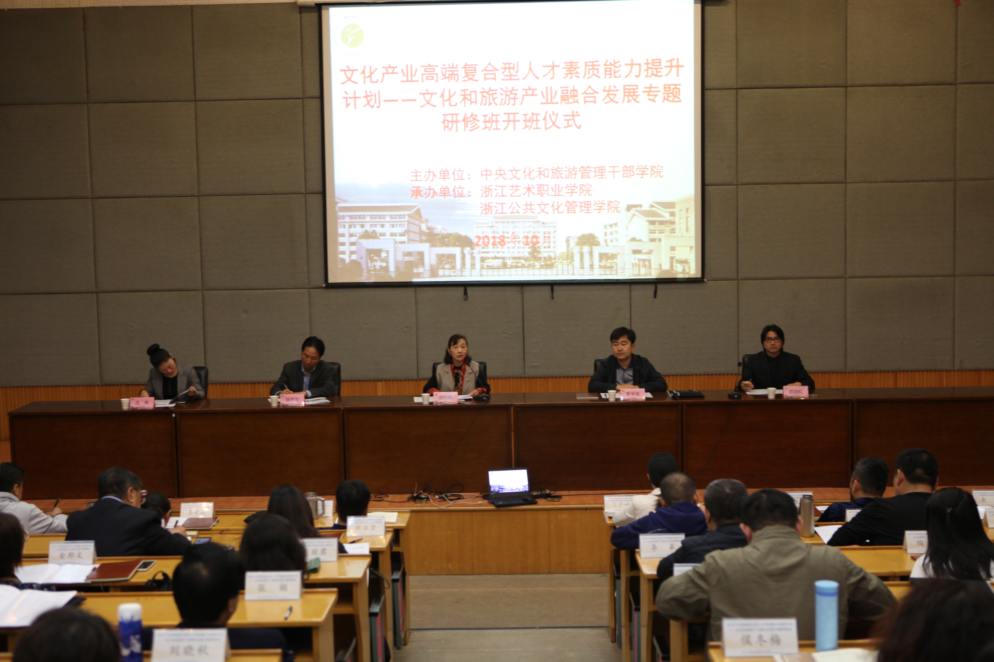 10月21日,由文化和旅游部产业发展司、中央文化和旅游管理干部学院主办的文化和旅游产业融合发展专题研修班开班仪式在全国文化干部培训基地浙江艺术职业学院(浙江公共文化管理学院)举办。64名来自全国各省、自治区、直辖市、新疆生产建设兵团、各计划单列市文化行政管理部门产业处负责人、相关文化和旅游企业负责人参加本期研修班。文化和旅游部产业发展司李学斌、浙江省文化厅产业处处长钱剑力、浙江艺术职业学院院长黄杭娟参加开班式。