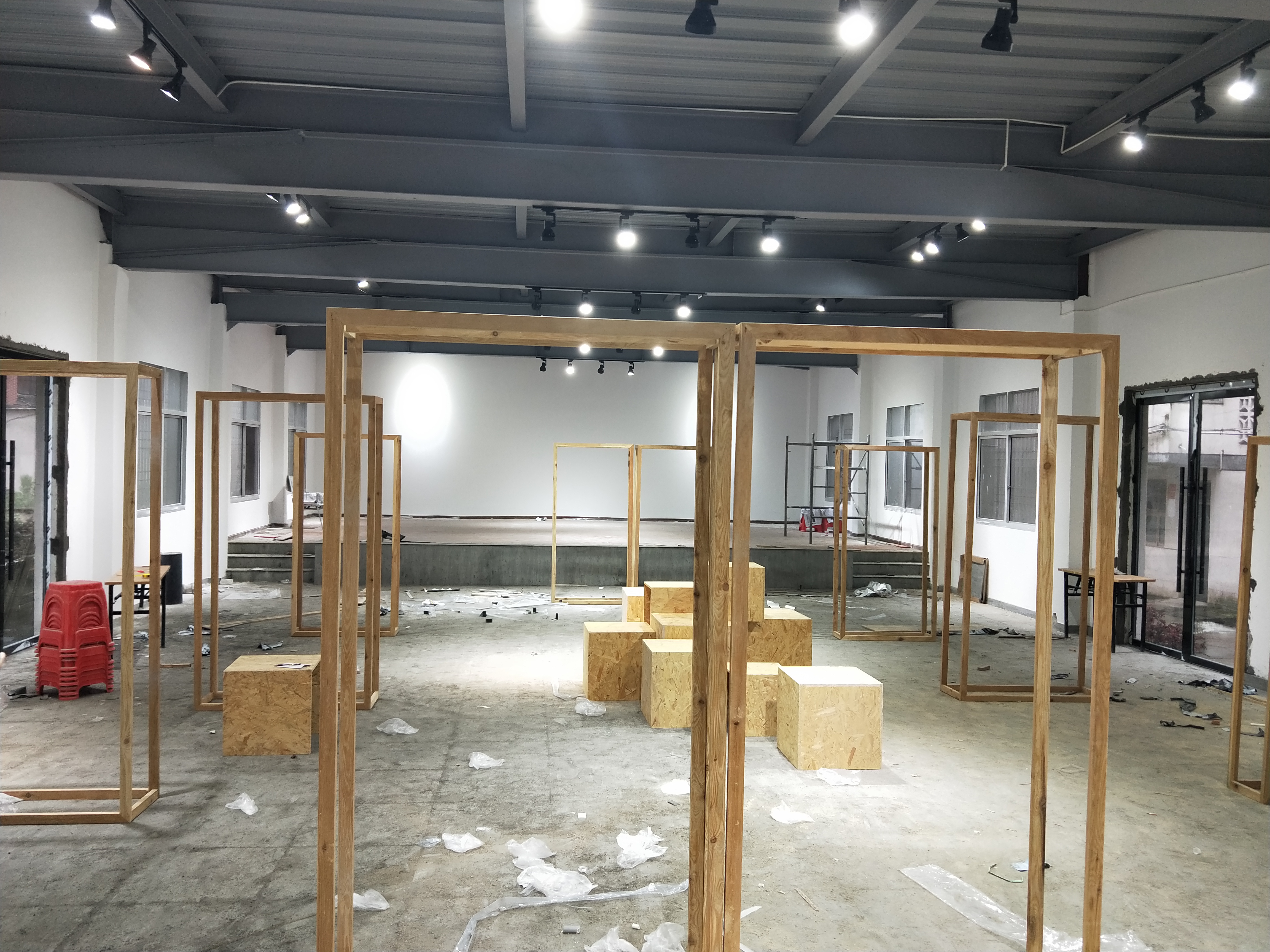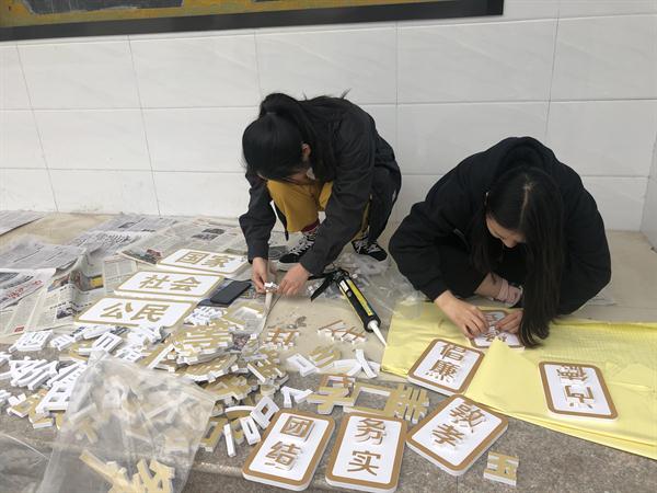 为提高展厅与效果图的接近度,同学们在现场做了二次数据记录。经过一天整理,大家对礼堂整体布局进一步了解,在制作材料到达现场后,大家立即分组进行布置陈列,根据实地环境,在老师指导下不断进行调整与修改。