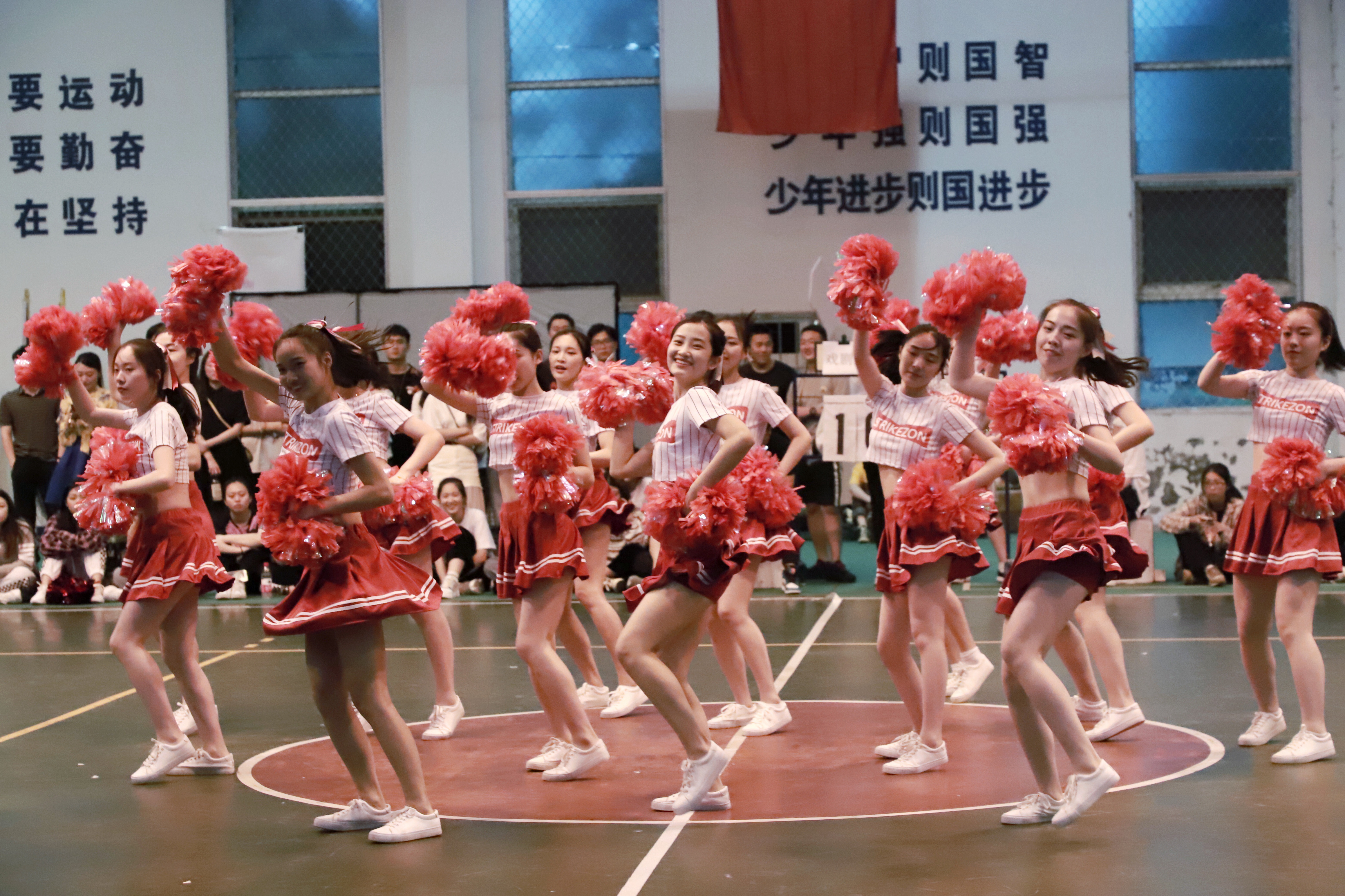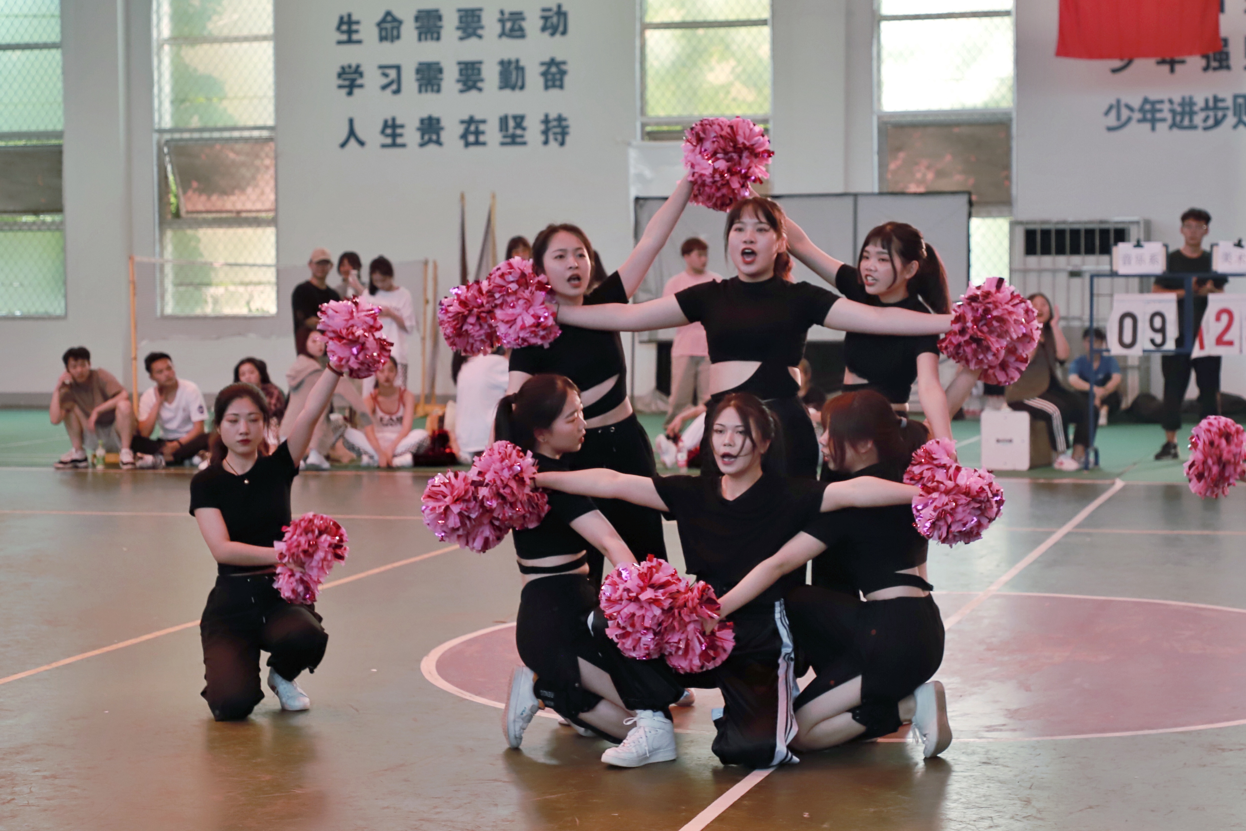 答:这个曲目是我们舞蹈老师选的,因为考虑到要调动现场气氛,我们就挑选了节奏比较明快的,比较嗨的曲目进行搭配啦啦操。(比赛分规定套路和自选套路,规定套路音乐由组委会提供,自选套路由各系自行决定)