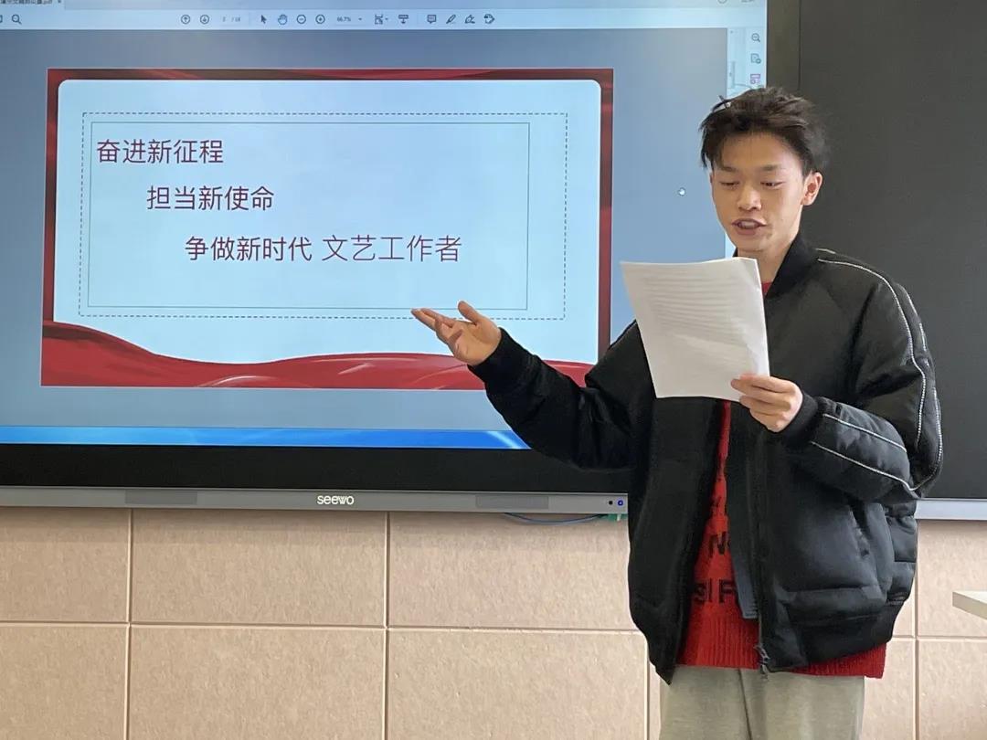 在微党课比赛过程中,戏剧系第38期的14名学员依次进行主题党课演讲,他们结合自己参与的文艺活动、创作的艺术作品为出发点,用鲜明的事例表明文艺工作的重要性,展现担当起文艺重任的决心和信心。