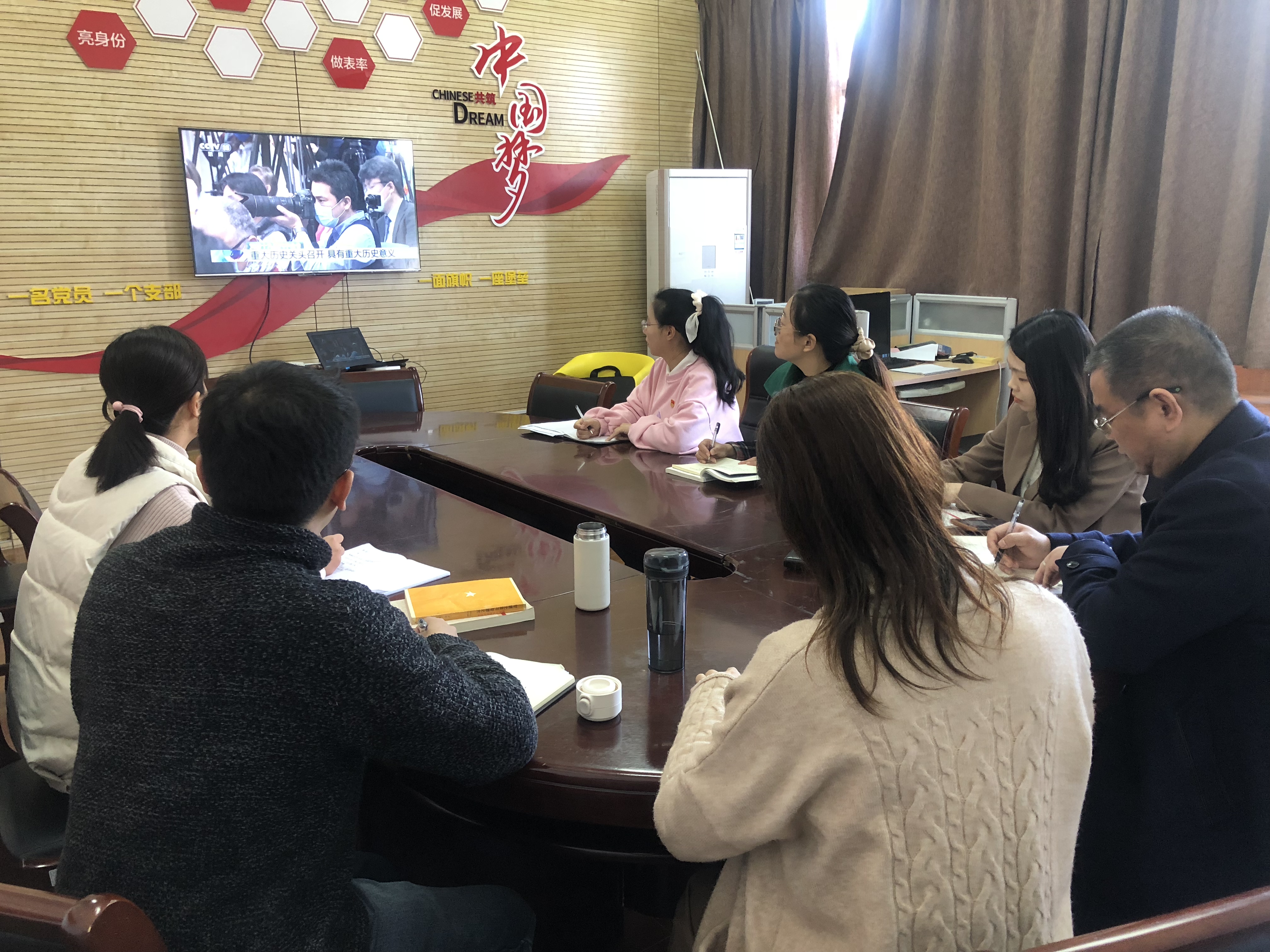 11月12日上午10时,直属社会科学部党支部组织全体党支部委员会委员、部门行政以及在校教师在13102会议室收看中国共产党第十九届中央委员会第六次全体会议新闻发布会,并开展交流讨论。其余未在校教师通过其他方式,第一时间收看此次新闻发布会,并以文字形式参加交流。