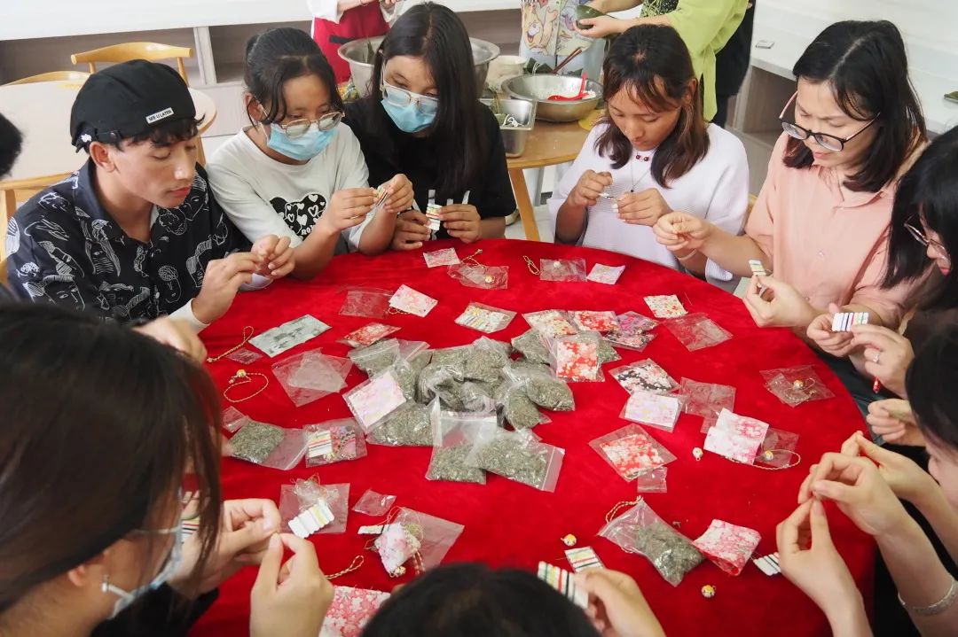 活动现场,师生围坐在一起包粽子、做香囊。在老师们的指导下,同学们将粽叶做漏斗状、填糯米、压紧实、封口、扎捆,不一会儿功夫,一只只漂亮的粽子瞬间成型。香囊的制作步骤虽有些复杂,但大家都认认真真地学,仔仔细细地做,从穿针引线到填充香料再到装饰收尾,把美好的祝福缝进香包。不一会儿,一个个造型可爱、立体饱满的香包就在大家的手中呈现出来,清香四溢,玲珑夺目。