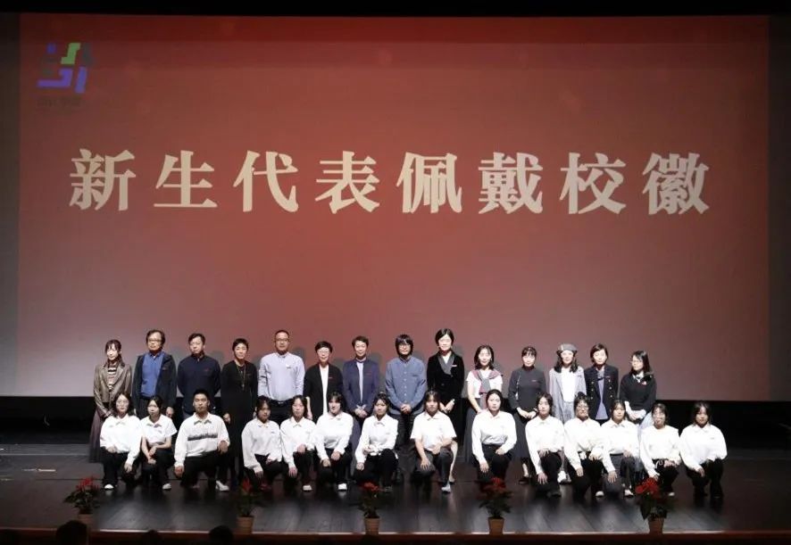 设计学院领导班子、基础教学部领导,设计学院各专业带头人和教研室主任为新生代表佩戴校徽。轻抚校徽,别于胸前,“求真、尚美、精艺、修为”的校训自此共勉。