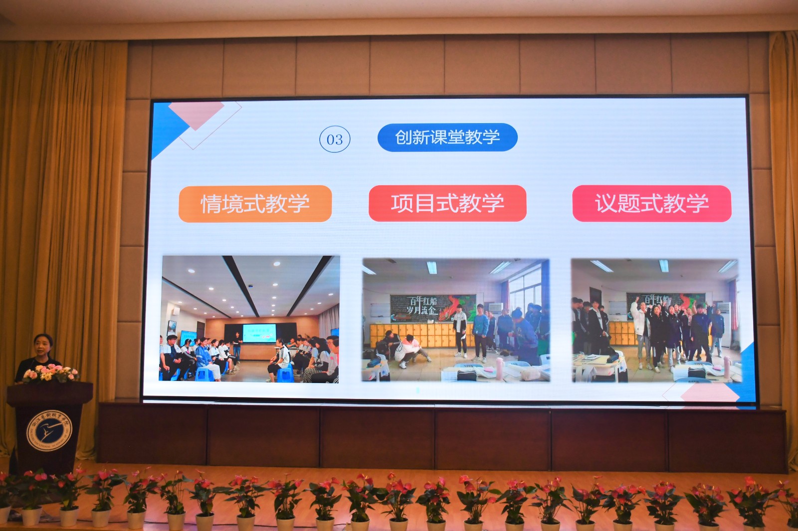 戏剧影视学院教研室主任代表姚春宏、舞蹈学院班主任代表褚琳、音乐学院专业教师代表赵瑾以及基础教学部文化教师代表邵岚作交流发言。他们回顾总结过去的不足,分享了教学方面的经验,针对当下的考情状况,对各大高校分数线的增长进行了分析,提出新学期的教学目标与计划。