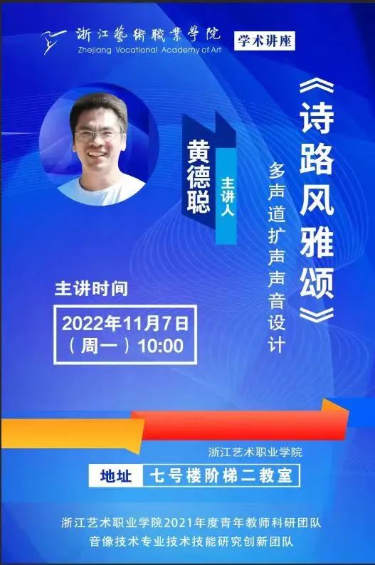 为使戏剧影视学院音像技术、声像工程专业的学生深化对专业技术知识的理解,感受扩声技术的魅力,11月7日,学校教学实践中心音响专业主任舞台技师、浙江舞台美术学会会员黄德聪带来青年教师科研团队学术讲座第2讲——《诗路风雅颂》多声道扩声声音设计。