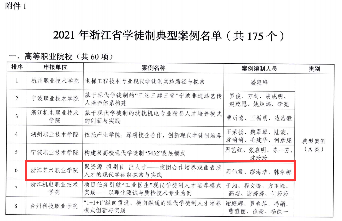 12月9日,由省教育厅、省人力社保厅和省职教社指导,浙江省学徒制研究中心主办的2022年浙江省中国特色学徒制研究学术报告会在杭州顺利举行。会上公布了2021年浙江省学徒制典型案例评选结果,浙江艺术职业学院申报的《聚资源 推剧目 出人才——校团合作培养戏曲表演人才的现代学徒制探索与实践 》荣获高等职业院校典型案例(A类)。戏曲学院副院长周伟君受邀参会并做主旨发言。