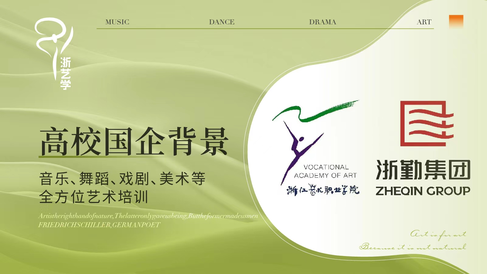 浙艺学艺术培训中心依托股东方浙江艺术职业学院的专业教学质量管理和浙勤集团企业运营管理等方面的经验,强强联合,以培育真善美的复合型艺术人才为目标,现已开设音乐(声乐、器乐、奥尔夫音乐、音乐素养等)、舞蹈(中国舞、街舞)、口才、戏剧、美术、书法、陶艺等青少年艺术素养课程,并将持续深耕文化艺术培训的发展创新,积极培育新一代浙江文艺新星。