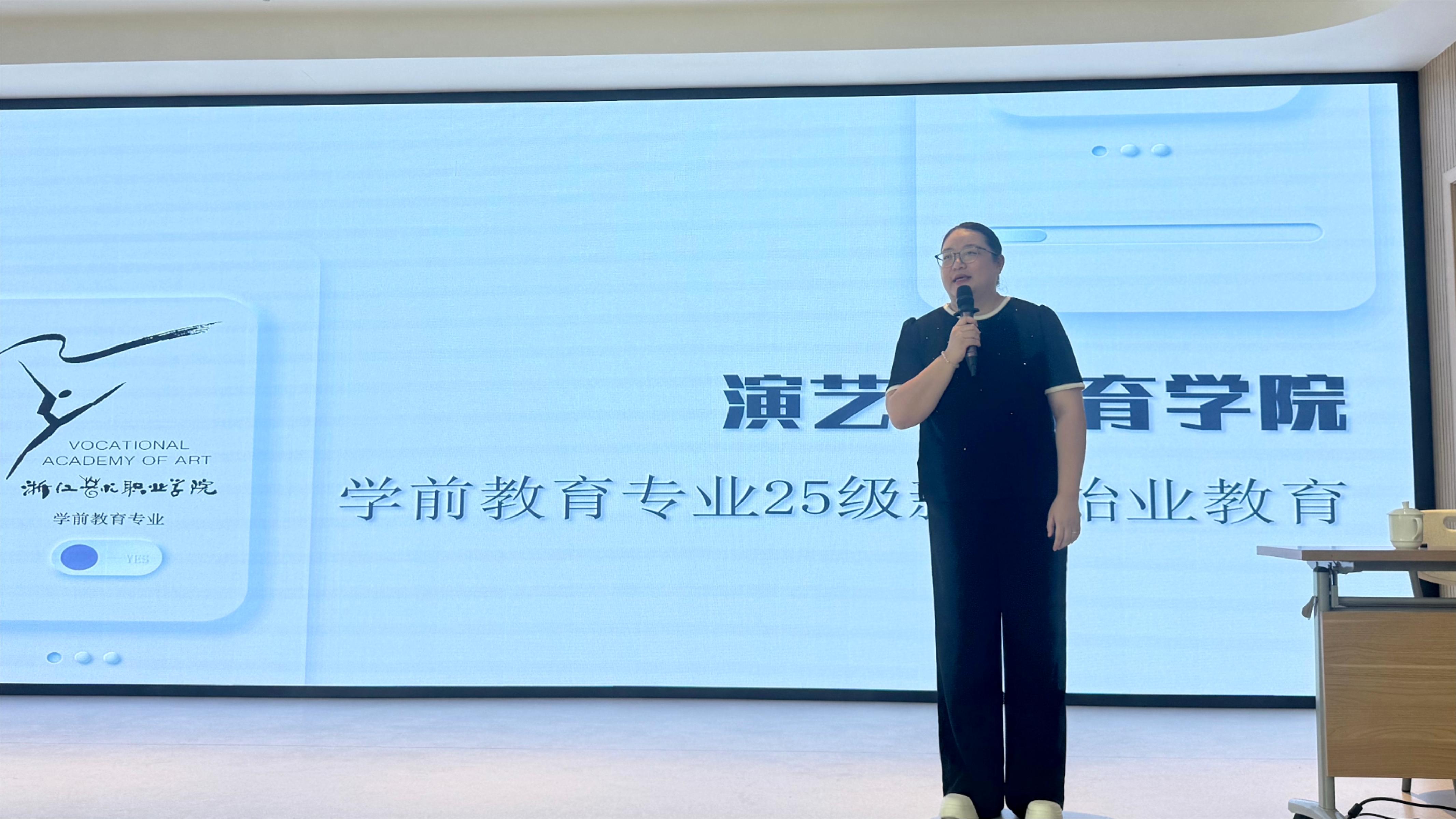 学前教育教研室主任卢茜向新生们介绍了教研室授课教师团队,并梳理了未来三年的课程设置、实习安排、校内外专业活动以及各类重要赛事。她结合行业发展趋势讲解了专业升学与就业前景,同时分享了优秀毕业生的成长经历与发展现状,激励新生们树立专业信心,明确学习方向