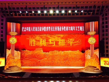 9月3日晚,纪念中国人民抗日战争暨世界反法西斯战争胜利70周年文艺晚会《胜利与和平》在北京人民大会堂隆重举行。整场晚会以抗战重要历史节点和典型事件场景为主线,选取抗战经典歌曲,把气势磅礴的大合唱作为主要表现形式,融合交响化和民族化的音乐、舞蹈、戏剧、情境表演、诗朗诵、多媒体等艺术手段,主题鲜明,主线突出,大气磅礴,催人奋进,唱响了中国人民抗击侵略的英雄凯歌,抒写了中华民族共御外侮的壮丽史诗,突出表现了中国共产党在抗战中的中流砥柱作用,反映了中国作为东方主战场为世界反法西斯战争胜利作出的不可磨灭的贡献。