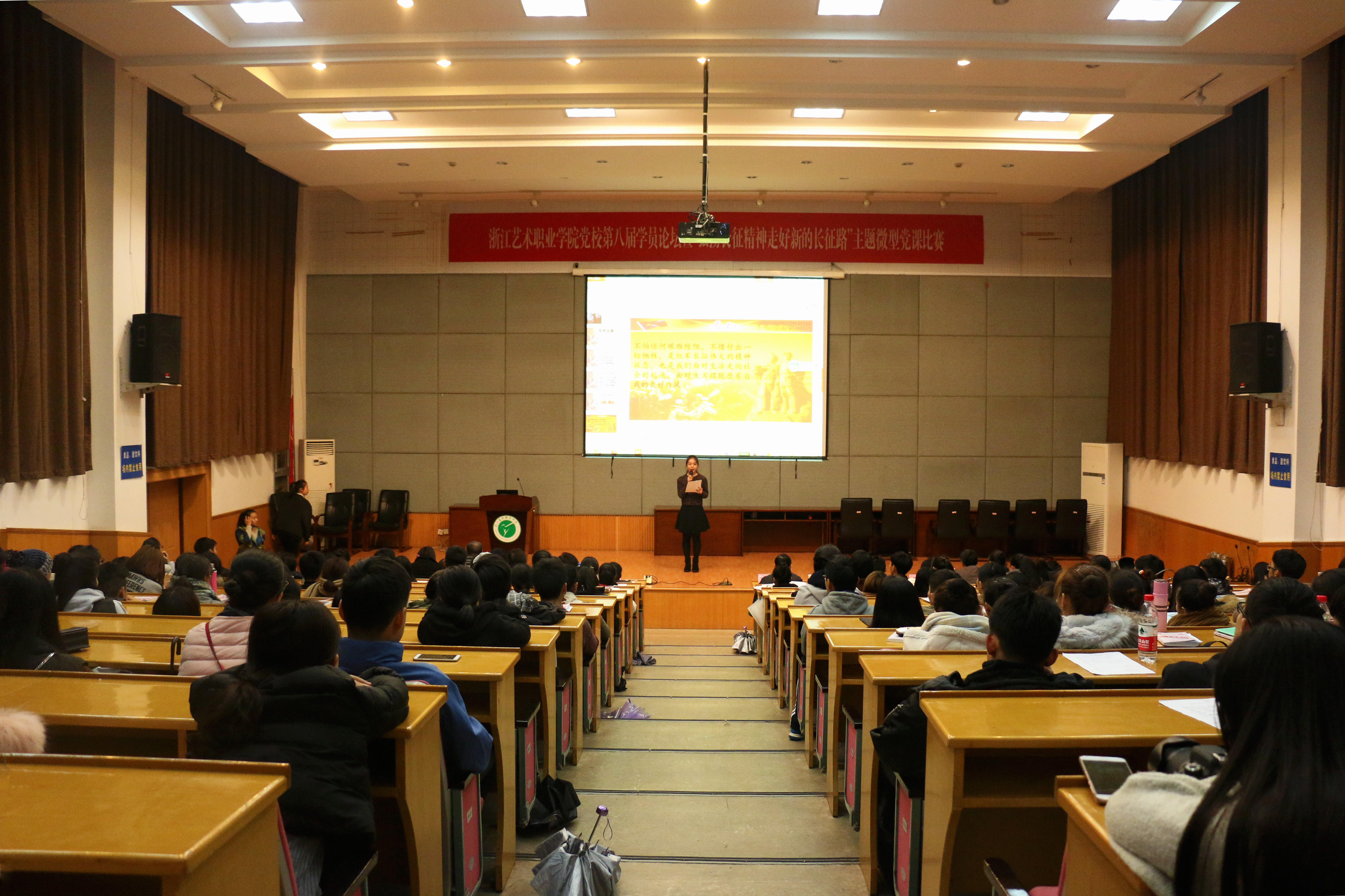 11月23日晚,浙江艺术职业学院党校第八届学员论坛暨“弘扬长征精神,走好新的长征路”主题微型党课比赛举行,来自全院6系的12名党校第28期培训班学生进行角逐,阐释长征精神,回忆红军故事,紧扣时代发展,抒发走好新的长征路的信念和情怀。